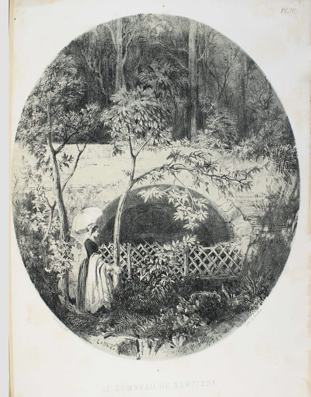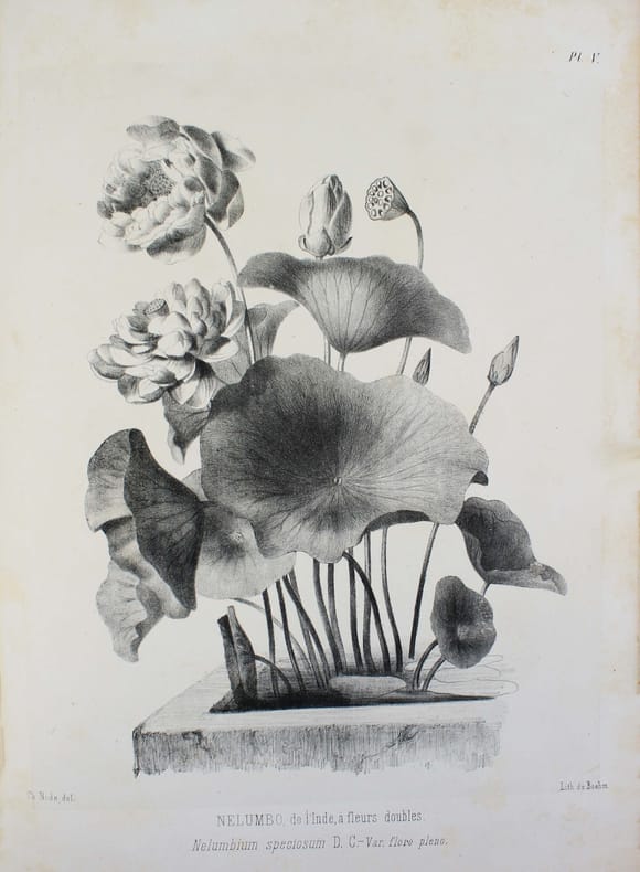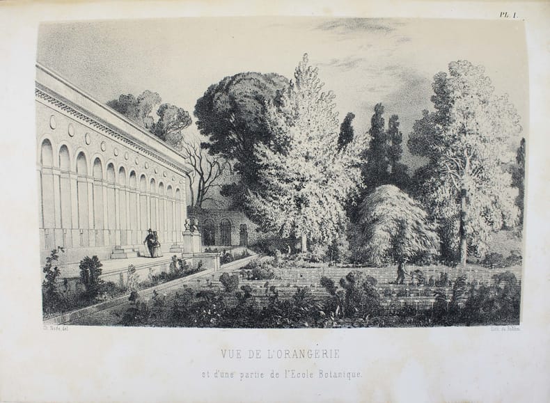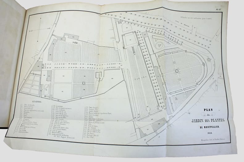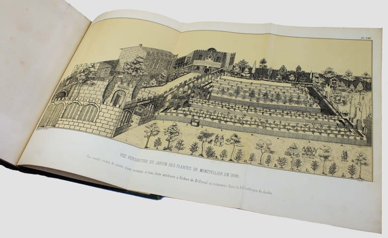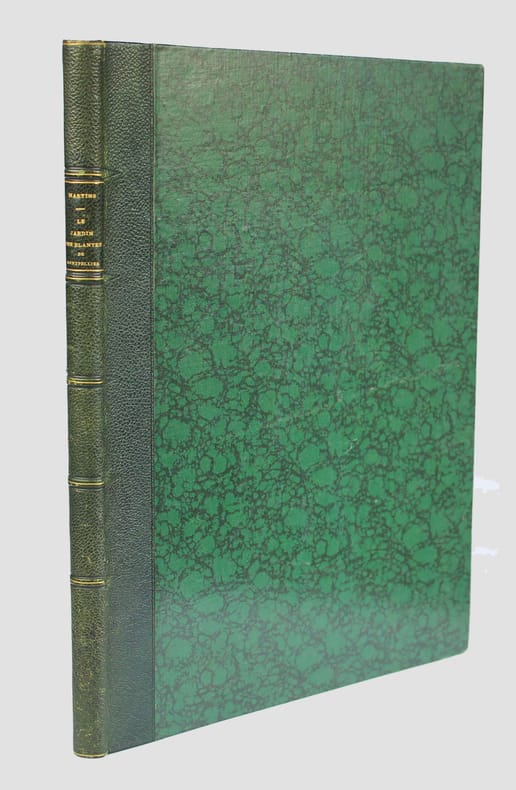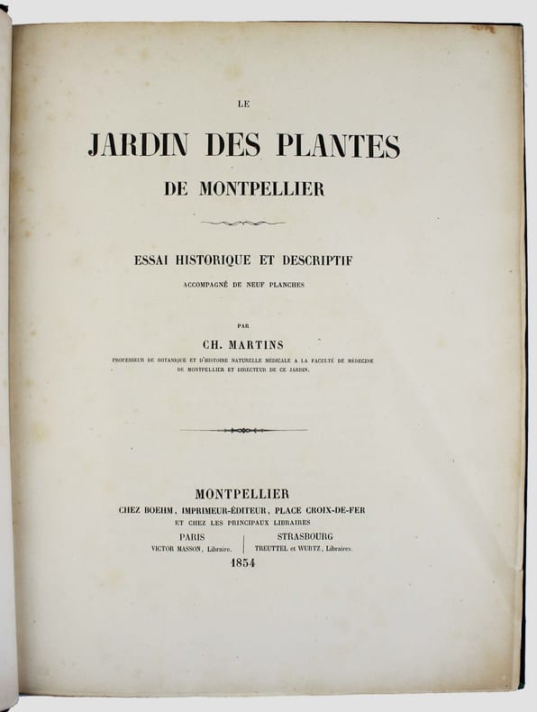 Première édition. Une intéressante histoire du plus ancien jardin botanique de France, un lieu majeur de l'histoire de la botanique. Elle est illustrée de charmantes vues du jardin en lithographies teintées de Boehm, d'après Bonaventure Laurens et Node. Les plus belles planches sont de Bonaventure Laurens. Cet artiste de talent était aquarelliste, lithographe, et aussi musicien. Il a participé aux "Voyages pittoresques et romantiques de l'ancienne France" de Taylor et Nodier et a publié des "Souvenirs d'un voyage d'art à l'île de Majorque", imprimé à Montpellier en 1840, illustrés également par la lithographie. On trouve aussi dans ce volume un portrait de Richer de Belleval et un autre de Magnol, un plan dépliant et une vue dépliante du jardin en 1596 d'après une estampe, attribuée à Richer de Belleval, et dont la seule connue se trouve à Montpellier. Charles-Frédéric Martins (1806-1889) a été professeur de botanique à la Faculté de médecine de Montpellier et directeur du Jardin des plantes de 1851 à 1879. Très bel exemplaire de cet ouvrage peu commun. /// Grand in-4 de 90, (2) pp., 9 planches h.-t. Demi-chagrin vert, dos à nerfs. (Reliure de l'époque.) //// Only one copy in USA in Worldcat (Harvard).