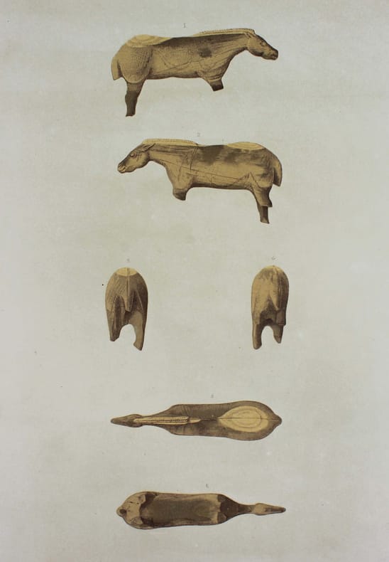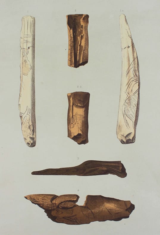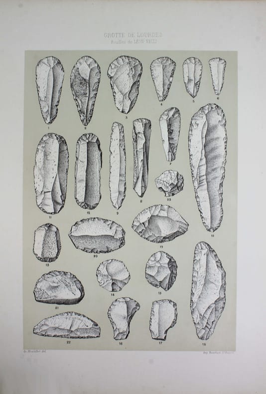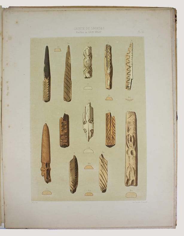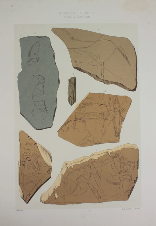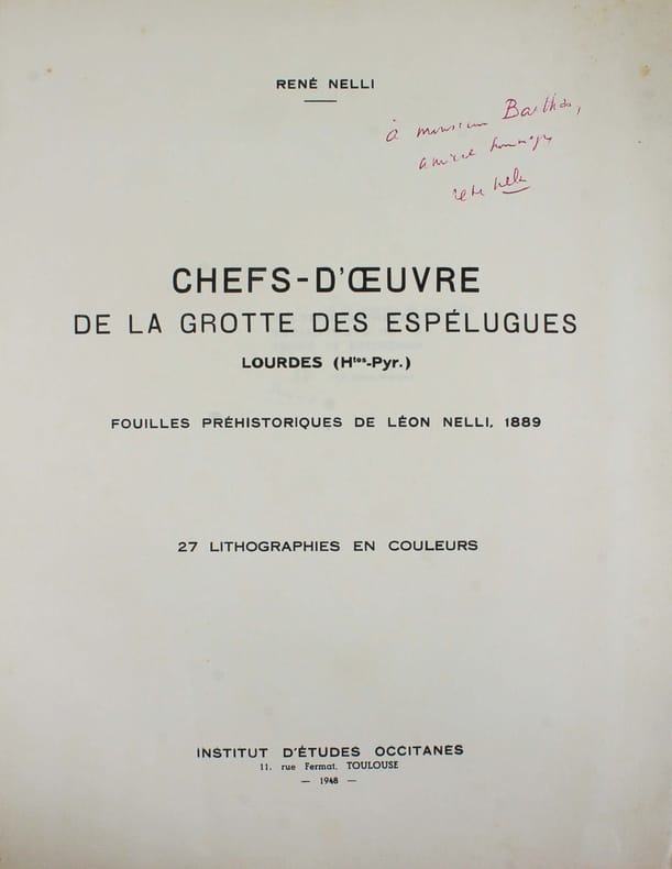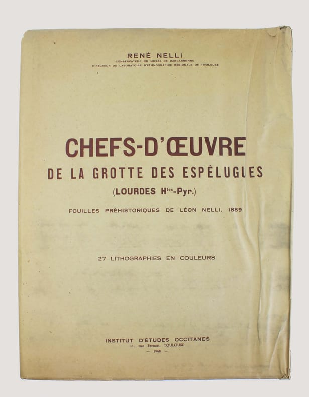 Portefeuille de 27 lithographies en couleurs illustrant les fouilles préhistoriques de Léon Nelli de 1886 à 1889. Il y a découvert la célèbre statuette en ivoire de mammouth, dite le "Cheval de Lourdes". Les lithographies ont été exécutées vers 1900 et n'avaient alors jamais été publiées. Elles le sont ici par son fils René Nelli, à 100 exemplaires numérotés et signés. Envoi de René Nelli "à monsieur Barthes, amical hommage". Couverture imprimée froissée. Bon exemplaire. /// In-folio de (6) pp., 27 planches h.-t. Porte-feuille, couverture imprimée. //// Portfolio of 27 color lithographs illustrating Léon Nelli's prehistoric excavations from 1886 to 1889. He discovered the famous mammoth ivory statuette known as the Cheval de Lourdes. The lithographs were produced around 1900 and had never been published. They are published here by his son René Nelli, in an edition of 100 numbered and signed copies. Envoi de René Nelli à monsieur Barthes, amical hommage. Printed cover creased. A good copy. No copy in Worldcat.