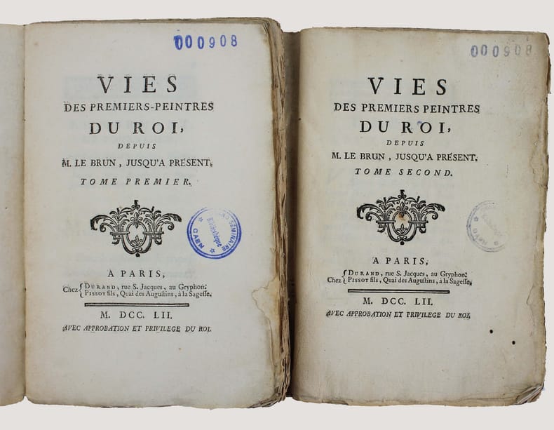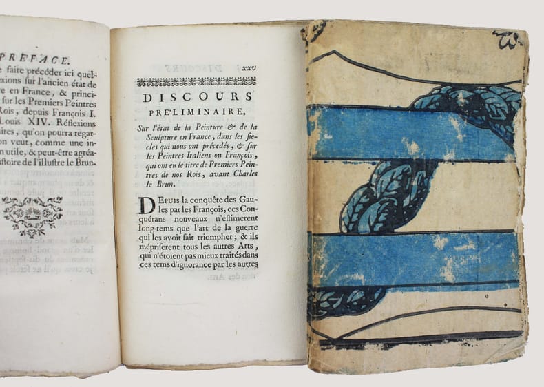 Bel exemplaire en papier dominoté. Première édition. Publication attribuée à François-Bernard Lépicié qui était graveur et historiographe de l'Académie Royale de peinture et de sculpture. Contient : Discours préliminaire sur l'état de la peinture et de la sculpture en France dans les siècles qui nous ont précédés et sur les peintres italiens ou françois qui ont eu le titre de premiers peintres de nos rois avant Charles Le Brun, par Desportes. Vies de Charles Le Brun, Antoine Coypel (par Charles Coypel, son fils), Pierre Mignard (par le Comte de Caylus), Franc?ois Lemoyne, Louis de Boulogne (par Watelet). Description de la peinture de la galerie de la Banque royale peinte par le Pellegrini. Il manque le faux-titre du tome second. Cachet d'un séminaire sur les titres. Couvertures légèrement usées mais charmant exemplaire tel que paru. /// 2 volumes in-12 de LXXX, 178 / (4), 143, (7) pp. Broché, couverture dominotée de l'époque. //// Fine copy in dominoté paper. First edition. Publication attributed to François-Bernard Lépicié, engraver and historiographer of the Académie Royale de peinture et de sculpture. Contains : A preliminary discourse on the state of painting and sculpture in France in the centuries before us and on the Italian or French painters with the title of First Painters of our Kings before Charles Le Brun, by Desportes.. Lives of Charles Le Brun, Antoine Coypel (by Charles Coypel, his son), Pierre Mignard (by Comte de Caylus), François Lemoyne, Louis de Boulogne (by Watelet). Description of the painting of the Royal Bank gallery by Pellegrini. Half-title of second volume missing. Seminary stamp on titles. Covers slightly used but a charming copy as issued.