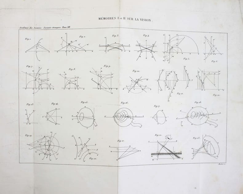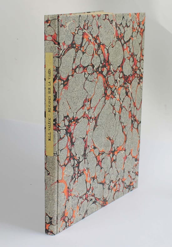 Première édition. Louis Léger Vallée, polytechnicien et ingénieur des Ponts et Chaussées, a étudié la théorie de l'oeil et de la vision. Contient quatre mémoires, les deux premiers mémoires sont un tiré a part des "Mémoires présentés par divers savants à l'Académie des Sciences". A la fin du quatrième mémoire, il annonce qu'il s'occupera "des yeux cataractés" dans le mémoire suivant, mais il n'a jamais été publié. Auréole d'humidité sur les deux derniers mémoires. Très rare. /// In-4 de (4), 108 pp., 1 planche dépliante h.-t. Cartonnage moderne //// First edition. Louis Léger Vallée, Polytechnician and a Ponts et Chaussées engineer, studied the theory of the eye and vision. Contains four memoirs, the first two of which are an offprint from Mémoires présentés par divers savants à l'Académie des Sciences. At the end of the fourth memoir, he announces that he will deal with cataractous eyes in the following memoir, but it was never published. Damp stain on the last two memoirs. Very rare.