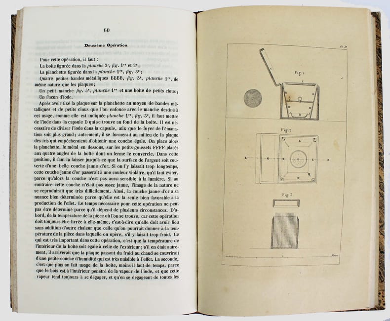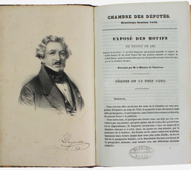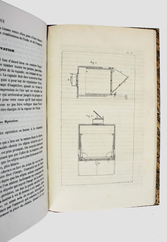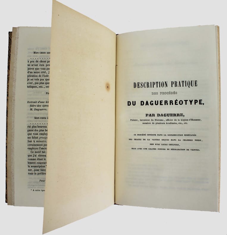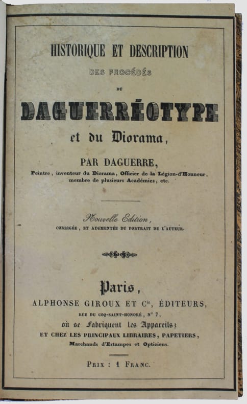 Seconde édition, parue un mois après la première édition dont on ne connait que quelques exemplaires. Celle-ci a été imprimée par Félix Malteste. Le texte est identique, l'éditeur a ajouté le portrait de Daguerre, un "avis de l'éditeur" page 72 et a regravé les planches avec l'ajout d'une figure n° 7 sur la première planche. "A partir de septembre (1839), trente-neuf éditions, ou réimpressions et traductions se succédèrent en moins de dix-huit mois (...). Grâce au livre, en peu de temps, le monde occidental connaissait le nom de Daguerre. En français dans le texte 255. Illustré par un portrait en frontispice et 6 planches gravées. La couverture imprimée a été conservée. Provenance : "Bianchi. 11 rue du Coq St. Honoré. Paris." (cachet). Bianchi, marchand et fabricant d'optique, a été un pionnier du daguerréotype. Il tenait boutique à Toulouse et à Paris. Sa boutique de la rue du Coq Saint Honoré était à quelques numéros de celle de Giroux, dépositaire exclusif du daguerréotype. Bianchi est l'auteur de la plus ancienne photographie connue de la ville de Toulouse, un daguerréotype de 1839. Cet exemplaire provient d'une collection toulousaine. Très bel exemplaire. /// In-8 de couverture imprimée, (4) pp., portrait, 76 pp., 6 planches. Demi-veau brun, dos orné. (Reliure de l'époque.) //// Second edition, published one month after the first edition, of which only a few copies are known. This one was printed by Félix Malteste. The text is identical, the publisher has added an engraved portrait of Daguerre, an avis de l'éditeur on page 72, and has re-engraved the plates with the addition of a figure no. 7 on the first plate. "From September (1839), thirty-nine editions, or reprints and translations, followed one another in less than eighteen months (...). Thanks to the book, in no time the Western world knew the name of Daguerre. Illustrated with a frontispiece portrait and 6 engraved plates. The printed cover has been preservbeund in. Provenance: "Bianchi. 11 rue du Coq St. Honoré. Paris." (stamp). Bianchi, an optics dealer and manufacturer, was a pioneer of the daguerreotype. He had stores in Toulouse and Paris. His store in the rue du Coq Saint Honoré was just a few numbers away from Giroux's, the daguerreotype's exclusive dealer. Bianchi is the author of the oldest known photograph of the city of Toulouse, a daguerreotype dating from 1839. This copy comes from a Toulouse collection. A very beautiful copy. Printing and the Mind of Man 318b.