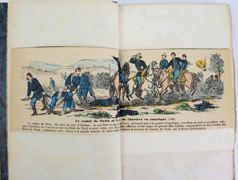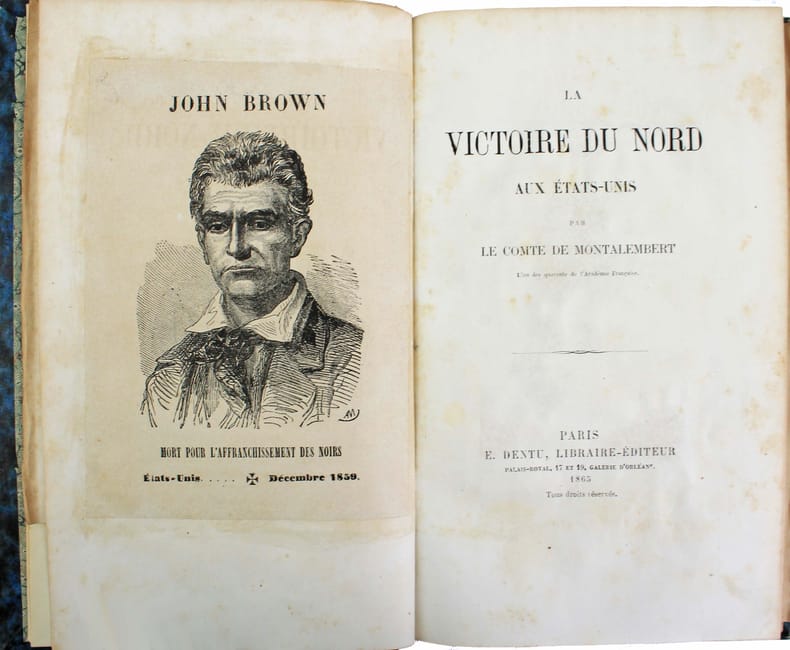 Première édition. Charles Forbes, comte de Montalembert (1810 - 1870), homme politique, catholique libéral analyse la Guerre de Sécession et se réjouit de l'heureuse victoire "qui vient d'assurer aux Etats-Unis le triomphe du Nord sur le Sud, c'est à dire du pouvoir légitime sur une révolte inexcusable, de la justice sur l'iniquité, de la vérité sur le mensonge, de la liberté sur l'esclavage." Illustré par une carte dépliante en couleurs. Une gravure en couleurs et un portrait de l'auteur ajouté en tête du volume. Un portrait de John Brown collé au verso du faux titre. Une gravure (extraite de la Case de l'Oncle Tom) collée au verso du titre. Coiffes frottées. /// In-8 de 160 pp., 1 carte dépliante. Demi-basane bleue, dos orné. (Reliure de l'époque.) //// First edition. Charles Forbes, comte de Montalembert (1810 - 1870), politician and liberal Catholic, analyzes the American Civil War and rejoices in this happy victory that brought the triumph of the North over the South, that is, of legitimate power over inexcusable revolt, of justice over iniquity, of truth over falsehood, of liberty over slavery. Illustrated with a color fold-out map. A color engraving and portrait of the author added at the head of the volume. A portrait of John Brown pasted to the verso of the half-title. An engraving from Uncle Tom's Cabin pasted on the verso of the title. Spines ends rubbed.