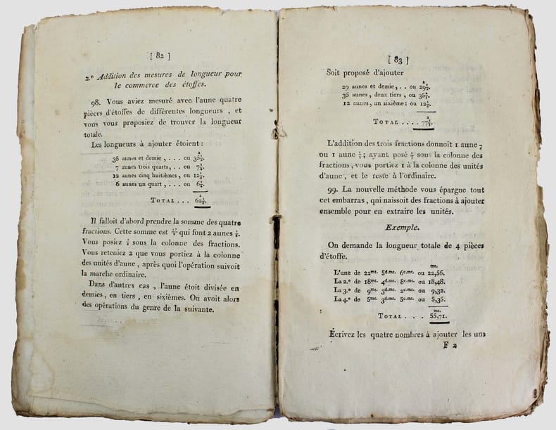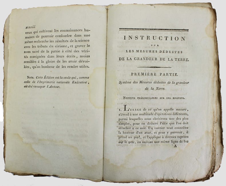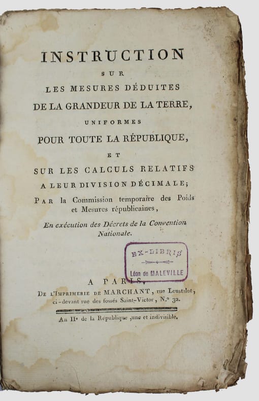 Première édition de ce texte fondateur du système métrique et dont on attribue la rédaction à René-Just Haüy. Illustré par une planche dépliante. Il y a eu plusieurs tirages en même temps, dont celui de l'Imprimerie Nationale. A la fin des feuillets préliminaires on lit : "Nota. Cette édition est la seule qui, comme celle de l'Imprimerie Nationale Exécutive, ait été revue par l'auteur." Cette édition parisienne a été suivie de nombreuses impressions en province. A la fin, à la suite des : "Tables pour réduire les anciennes mesures de longueur, de superficie, de capacité et les anciens poids, en mesures et poids du nouveau système décrété par la Convention nationale", on trouve une table des matières qui manque au tirage de l'Imprimerie Nationale. Exemplaire tel que paru, un peu usé : manque de papier au dos de la brochure, couverture en patie détachée, des auréoles d'humidité, petits trous dans la marge du dernier feuillet (errata). /// In-8 de XXVIII, 224, (28), VI, (2) pp., 1 planche dépl. Broché, couverture muette de l'époque. //// First edition of this seminal text on the metric system, attributed to René-Just Haüy. Illustrated with a folding plate. There were several printings at the same time, including one by the Imprimerie Nationale. At the end of the preliminary pages, we read: Note. This edition is the only one, like the one of the Imprimerie Nationale, that has been reviewed by the author. This Parisian edition was followed by numerous printings in the provinces. At the end, following the Tables for converting old measures of length, area, capacity, and old weights into measures and weights of the new system decreed by the National Convention, there is a table of contents that is missing in the Imprimerie Nationale edition. Copy as published, slightly worn: missing paper on the spine of the brochure, cover partially detached, dampstainings, small wormholes in the margin of the last page (errata).