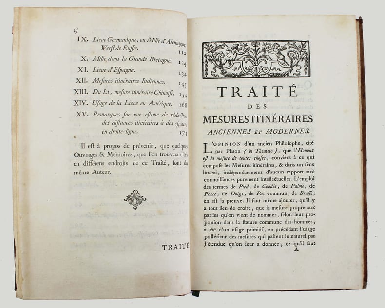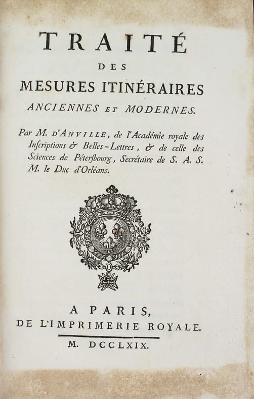 Première édition. Jean-Baptiste Bourguignon d'Anville (1697 - 1782) a largement contribué à la renaissance de la géographie et de la cartographie en France au XVIIIe siècle. Auteur de 211 cartes ou plans, il fait preuve dès ses premières publications d'une grande honnêteté intellectuelle en laissant en blanc des territoires inconnus. ... Il a fait des études sur les mesures anciennes dans plusieurs mémoires et dans son « Traité des mesures itinéraires anciennes et modernes ». (DSB 1, 176). Les plats sont frottés. Provenance : Léon de Maleville, de St-Maurice dans les Landes. (étiquette). /// In-8 de VI, 195 pp. Veau glacé, pièce de titre de maroquin rouge. (Reliure de l'époque.) //// First edition. Jean-Baptiste Bourguignon d'Anville (1697 - 1782) contributed greatly to the renaissance of geography and cartography in France in the eighteenth century. He was the author of 211 maps or plans, and from his first publications he demonstrated great intellectual honesty by leaving unknown territories blank. ... He made studies of ancient measurements in several memoirs and in his 'Traité des mesures itinéraires anciennes et modernes'. (DSB 1, 176). The boards are rubbed. Very good copy. Provenance: Léon de Maleville, from St-Maurice in the Landes. (sticked label). /// PLUS DE PHOTOS SUR WWW.LATUDE.NET