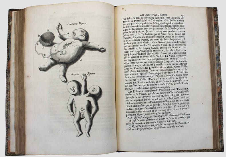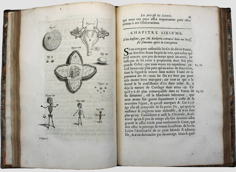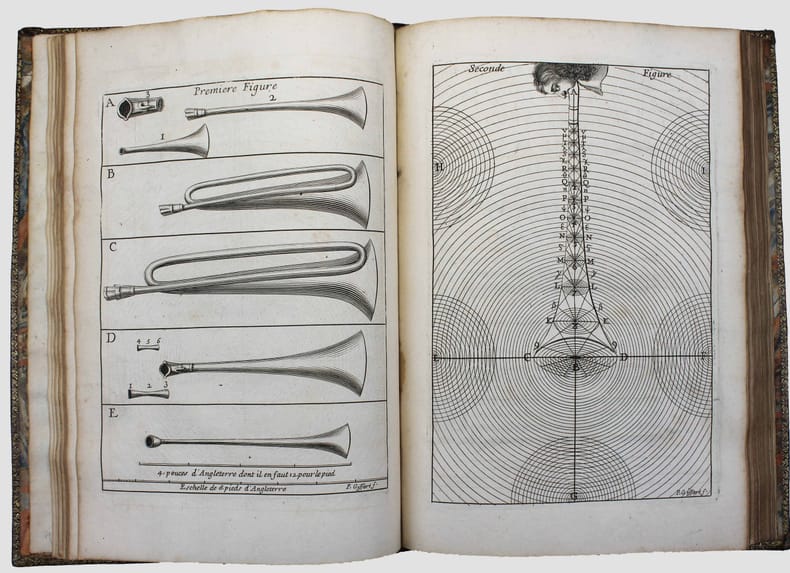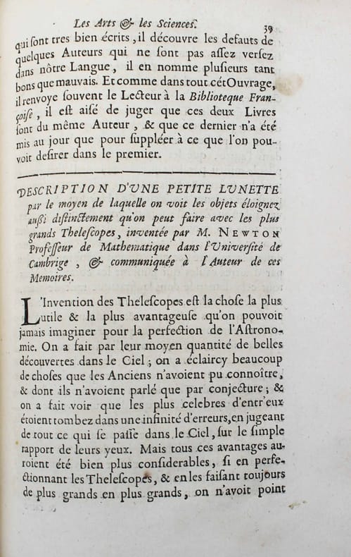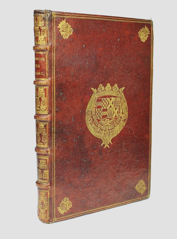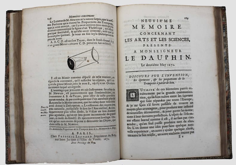 "Médecin parisien connu pour ses expériences sur la transfusion sanguine, réalisées en 1667 et 1668 sous l'impulsion d'Habert de Montmor, par les conférences académiques qu'il donna en son logis ... Jean-Baptiste Denis tenta de capter en 1672 le public du Journal des Savants" qui avait pratiquement cessé de paraître. Parmi les nombreux articles de ce périodique on trouve une "Description d'une petite lunette ... inventée par Mr. NEWTON ... communiquée à l'auteur de ces mémoires". La description est illustrée d'une planche. Isaac Newton construisit une première version de son télescope en 1671. On trouve plus loin (p. 20) une description du télescope de Laurent Cassegrain (avec une illustration). A la suite de cette page de titre "Recueil", de 1672, a été réuni les 12 numéros publiés des "Mémoires concernant les arts & sciences présenté à Monseigneur le Dauphin". L'abbé Galloys ayant reprit la publication du "Journal des savants" en 1672, il obtint l'interdiction du nouveau journal de Denis. Celui-ci transforma donc sa revue en "Conférence présentée à Monseigneur le Dauphin". On trouve ici les 7 premières "Conférences". Il en sera publié 7 autres en 1673 et 1674, et une dernière en 1683. Illustré par 9 planches gravées in et hors-texte et une gravure dans le texte. Sgard, Dictionnaire des journaux 1177. Splendide exemplaire en maroquin rouge aux armes du duc de Montausier (1607-1690) et de son épouse Julie-Lucie dAngennes. Le duc de Montausier avait été nommé en 1668 gouverneur du fils de Louis XIV, le Grand Dauphin, à qui cette revue est dédiée. Amateur des classiques latins, il a fait publier la belle collection des auteurs classiques "ad usum Delphini". /// In-4 de (8), 156, (4) pp. pp. 157 à 240, 9 planches. Maroquin rouge, encadrements sur les plats avec armes dorées au centre et chiffre couronné aux angles, dos à nerfs orné du même chiffre, tranches dorées. (Reliure de l'époque.) //// Jean-Baptiste Denis, known for his experiments on blood transfusion, launched this scientific journal to replace the 'Journal des savans', which was scarcely issued at this moment. With an illustrated article on the Newton's telescope. Contains all published issues of "Mémoires concernant les arts & sciences présenté à Monseigneur le Dauphin". This title was replaced latter on by "Conférence présentée à Monseigneur le Dauphin". We have here the first 7 conférences; 7 others were issued (1673-1674) and a single one in 1683. Splendid copy in red morocco with the arms of the Duc de Montausier and his wife Julie Lucia Angennes. The Duc de Montausier was appointed in 1668 governor of the son of Louis XIV, the Grand Dauphin, to whom this journal is dedicated.