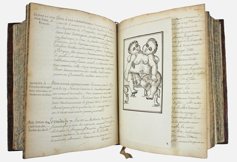 Manuscrit autographe original de l'astronome Charles Messier, grand découvreur de comètes, et auteur du fameux "catalogue Messier". Ce manuscrit, troisième volume d'un ensemble de quatre, constitue une partie du journal du jeune Charles Messier, alors âgé de 26 ans. Il y consigne avec une grande rigueur ses observations, vues ou rapportées, de phénomènes naturels et météorologiques pour lannée 1756. Ce journal contient également des anecdotes, des faits divers ou historiques, des comptes rendus de ses visites dans des lieux remarquables, ainsi que des récits dévénements populaires auxquels il a assisté. On peut y lire par exemple la description du cabinet de Réaumur (animaux quadrupèdes, minéraux, insectes, oiseaux dont un merle blanc et un canard à deux têtes...), le cabinet du Duc d'Orléans, la description dun véhicule allant de Paris à Versailles sans chevaux, des danseurs de corde vus à la foire Saint-Laurent... Ce document constitue un précieux témoignage de la méthodologie et de l'esprit dobservation du jeune Messier, offrant un éclairage sur ses préoccupations intellectuelles et son approche scientifique avant qu'il ne devienne une figure reconnue de lastronomie. Une section particulièrement développée du manuscrit près de deux cents pages est consacrée aux tremblements de terre. Profondément marqué, comme beaucoup de ses contemporains, par le séisme dévastateur de Lisbonne en 1755, Messier entreprend de réunir tous les témoignages qu'il peut trouver sur cette catastrophe. Dès lors, il sattachera à recenser de manière systématique les secousses survenues en France, en Europe, et autour de la Méditerranée en sappuyant sur les sources de lAcadémie des sciences ainsi que sur les gazettes quil consultait régulièrement. Cette partie inclut notamment un récit détaillé du tremblement de terre qui se produisit à Paris en avril 1756, auquel Messier assista alors quil dînait chez l'astronome Joseph-Nicolas Delisle. Ce document est illustré de quelques dessins et croquis, dont certains assez curieux. On y trouve, entre autres, une pompe à incendie, un enfant bicéphale sur un feuillet volant, un grand dessin dépliant de la machine de Marly , ainsi que divers plans illustrant ses visites aux cabinets de Réaumur, du duc d'Orléans, ou encore à la salle des gardes, où se tint le lit de justice du 21 août 1756. Quelques morceaux de papier glissés entres les pages portent des annotations manuscrites de Messier, certains semblent indiquer des positions d'astres. Selon Lalande, Charles Messier (Badonviller, Lorraine, 1730 - P., 1817) a observé au total quarante et une comètes, dont vingt et une qu'il revendique comme étant les siennes. Son premier mémoire, "Catalogue des nébuleuses et des amas d'étoiles, que l'on découvre parmi les étoiles fixes" (1771) est le catalogue le plus complet de nébuleuses et d'amas d'étoiles de l'époque. Il y décrit quarante-cinq des nébuleuses et amas les plus célèbres aujourd'hui. L'écriture de Messier est très nette et facilement lisible. C'est même pour ce talent que l'astronome Joseph-Nicolas Delisle (qui est plusieurs fois cité dans le manuscrit) l'avait engagé en 1751 ! La bibliothèque de Nancy possède le "Journal de mon voyage de Badonviller en Lorraine, à Paris. Tome IV." Selon la notice du catalogue, les trois autres volumes (dont le notre) sont dans une "collection particulière". Ils sont inédits et cités dans "Charles Messier, Le furet des comètes" de Jean-Paul Philbert. Éditions Pierron, 2000. Ex-libris gravé de Messier, "astronome de la Marine, de l'Académie Royale des Sciences, 1782". Reliure un peu restaurée. Bel exemplaire. /// In-4, [19,3 x 15,8 cm] de (1), 195 ff. Basane marbrée, dos lisse orné, tranches marbrées. (Reliure de l'époque.) //// Original autograph manuscript by astronomer Charles Messier, renowned comet discoverer and author of the famous Messier Catalog. This manuscript, the third volume of a four-volume set, is part of the journal kept by the 26-year-old Charles Messier. In it, he meticulously records his observations, seen or reported, of natural and meteorological phenomena for the year 1756. This journal also contains anecdotes, news items and historical facts, accounts of his visits to remarkable places, and descriptions of popular events. For example, it includes a description of Réaumur's cabinet of quadrupeds, minerals, insects, birds (including an albino blackbird and a two-headed duck !), the Duke of Orleans' cabinet, a description of a vehicle traveling from Paris to Versailles without horses, and the rope dancers seen at the Saint-Laurent fair... This document is a valuable testimony to the methodology and observational skills of the young Messier, offering insight into his intellectual concerns and scientific approach before he became a recognized figure in astronomy. A particularly extensive section of the manuscriptnearly two hundred pagesis devoted to earthquakes. Deeply affected, like many of his contemporaries, by the devastating Lisbon earthquake of 1755, Messier set out to gather all the accounts he could find of this disaster. From then on, he set about systematically recording the tremors that occurred in France, Europe, and around the Mediterranean, drawing on sources from the Academy of Sciences and the gazettes he consulted regularly. This section includes a detailed account of the earthquake that struck Paris in April 1756, which Messier witnessed while dining at astronomer Joseph-Nicolas Delisle's home. This document is illustrated with several drawings and sketches, some of which are quite curious. Among other things, there is a fire pump, a two-headed child on a loose sheet, a large fold-out drawing of the Marly machine, and various plans illustrating his visits to the cabinets of Réaumur, the Duke of Orleans, and the Guard Room, where the bed of justice was held on August 21, 1756. A few pieces of paper slipped