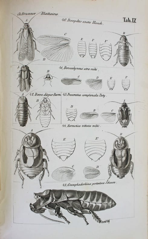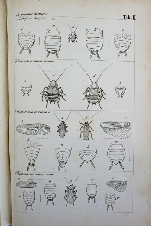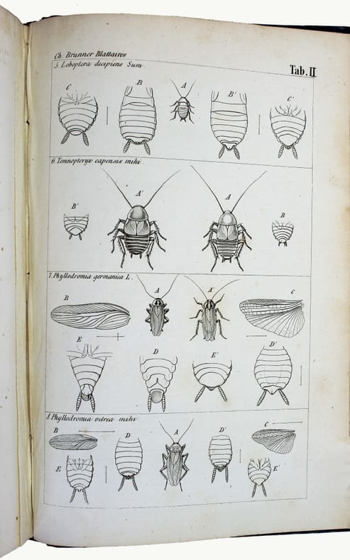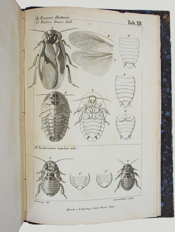 Rare monographie sur ces orthoptères. Illustrée par 13 planches gravées hors-texte. Déchirures à la page de titre, réparées et sans manques, reliure frottée. /// In-8 de XI, 426 pp, 13 planches. Demi-basane brune. (Reliure de l'époque.) //// Rare monograph on these orthoptera. Illustrated with 13 engraved plates. Tears on the title page, repaired and with no missing parts, binding rubbed. Nissen 635.