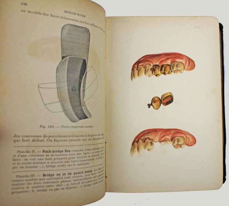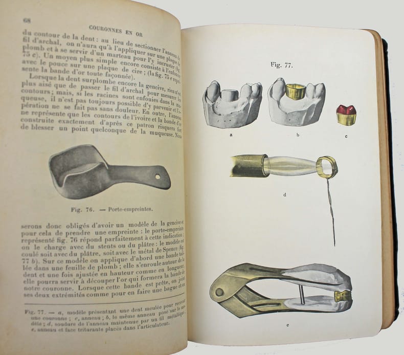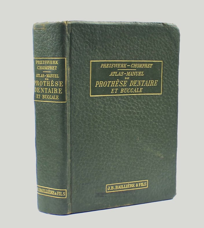 Première édition en français. 61 planches hors-texte en chromolithographie en couleur et plus de 300 en noir in-texte. Traduction par Chompret de "Lehrbuch und Atlas der der zahnarztlichen Technik", parue chez Lehmann à Munich en 1906. Bel exemplaire. /// In-12 de (4), 415, (1) pp. Toile verte imprimée de l'éditeur. //// /// PLUS DE PHOTOS SUR WWW.LATUDE.NET
