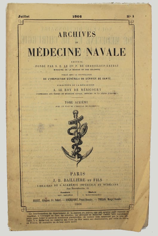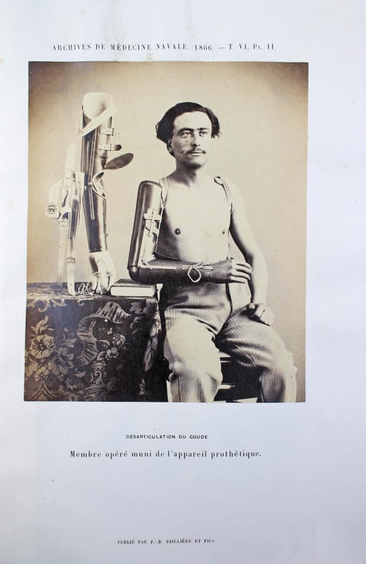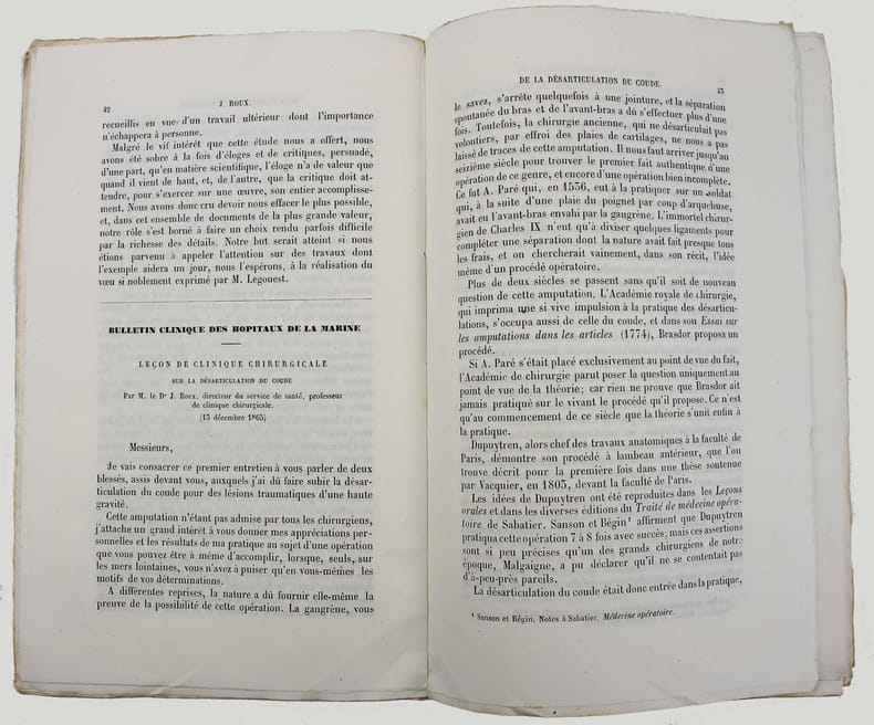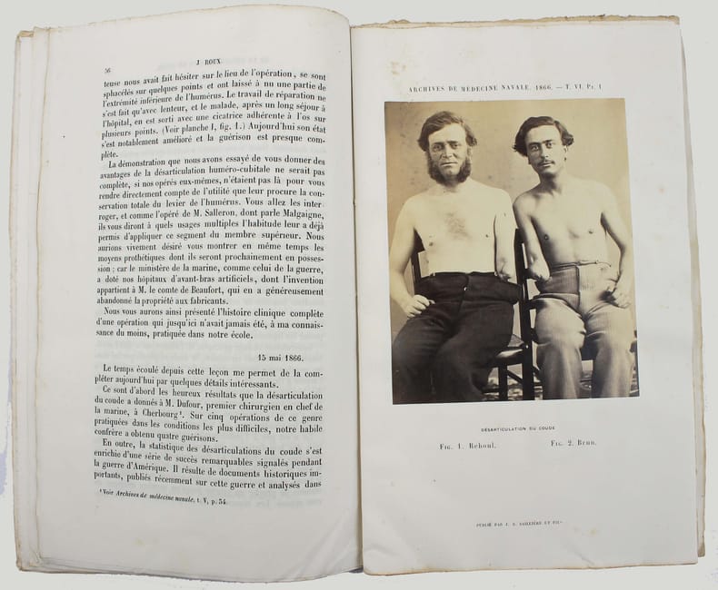 Article contenu dans cette livraison des "Archives de médecine navale", tome 6, pp. 42-47. Il est illustré par deux photographies sur albumine de Joseph-Hippolyte-Edouard Malespine : "Désarticulation du coude" et "Membre opéré muni de l'appareil prothétique." Jules Roux (1807-1877) était premier chirurgien en chef de la marine à Toulon. Très bon exemplaire, tel que paru, les photos sont très fraiches. /// In-8 de 80 pp., 2 pl. Broché, couverture imprimée. //// Included in this issue of "Archives de médecine navale", volume 6, pp. 42-47. It is illustrated by 2 photographs mounted albumens of the amputation and orthotic boot: Dislocation of the elbow and Operated limb fitted with prosthetic device. Joseph-Hippolyte-Édouard Malespine photographer. Jules Roux (1807-1877) was chief surgeon of the navy in Toulon. Very good copy, as issued, the photos are very fresh. /// PLUS DE PHOTOS SUR WWW.LATUDE.NET