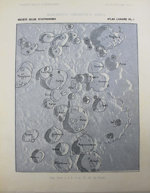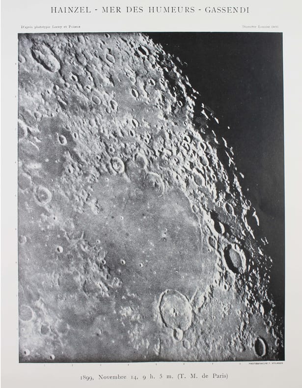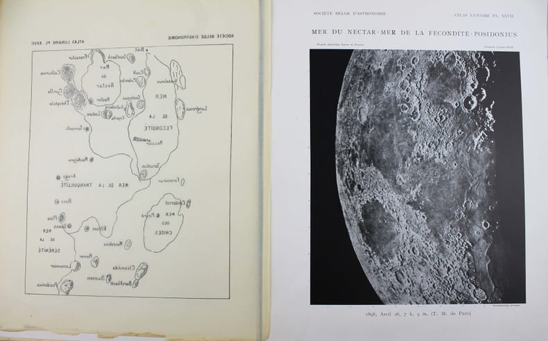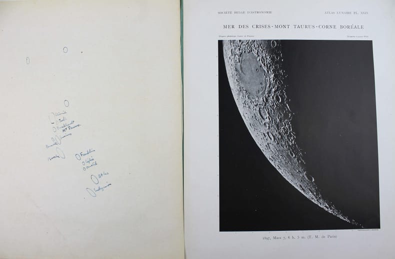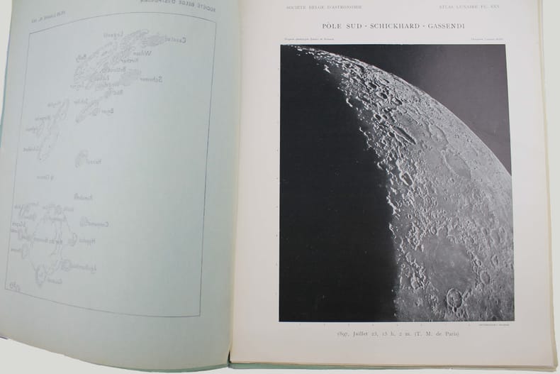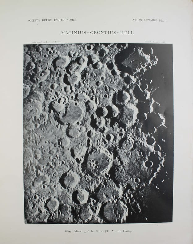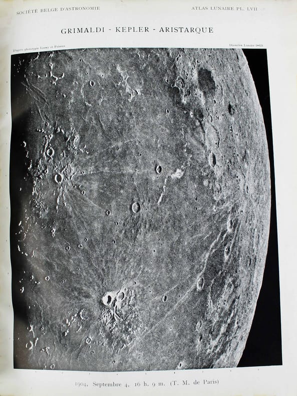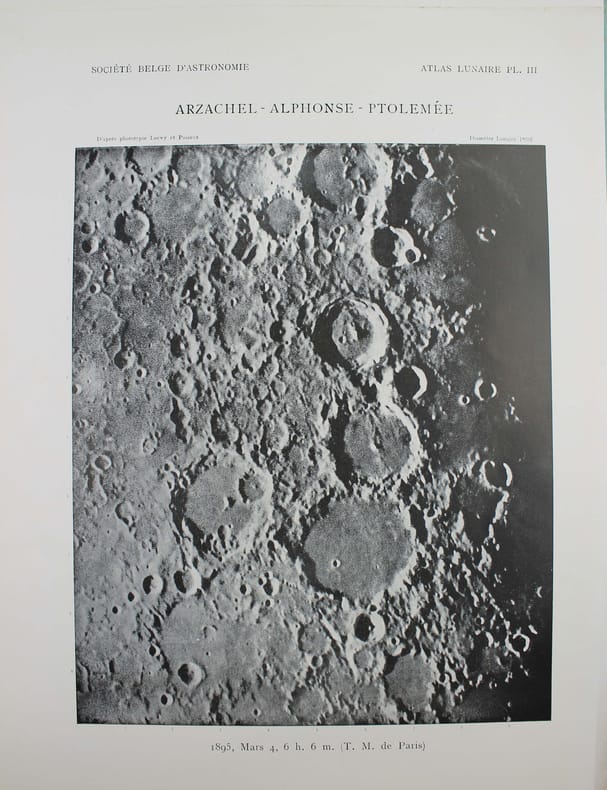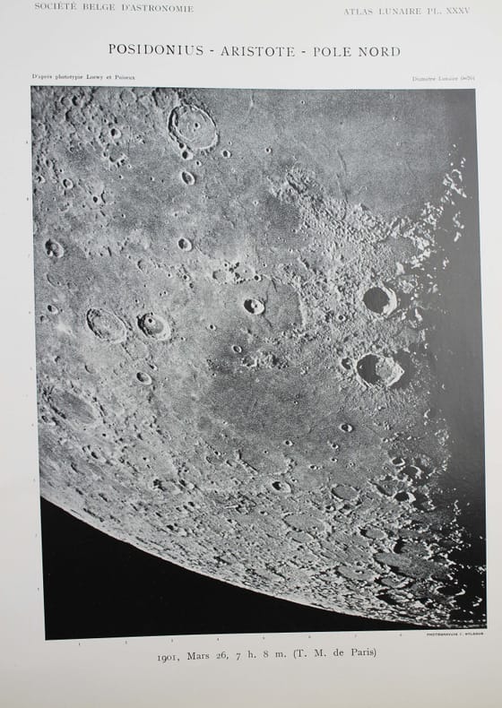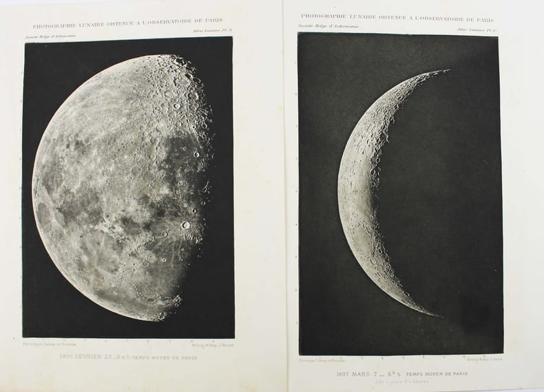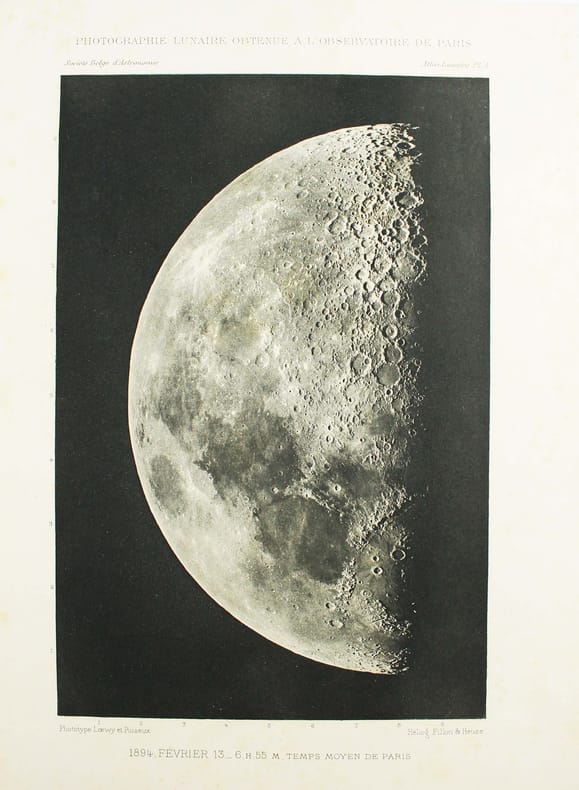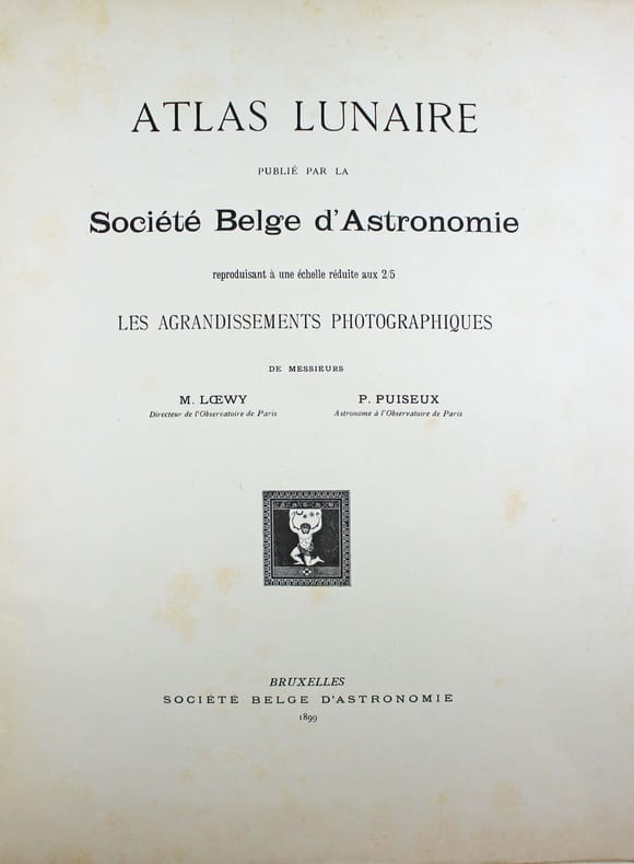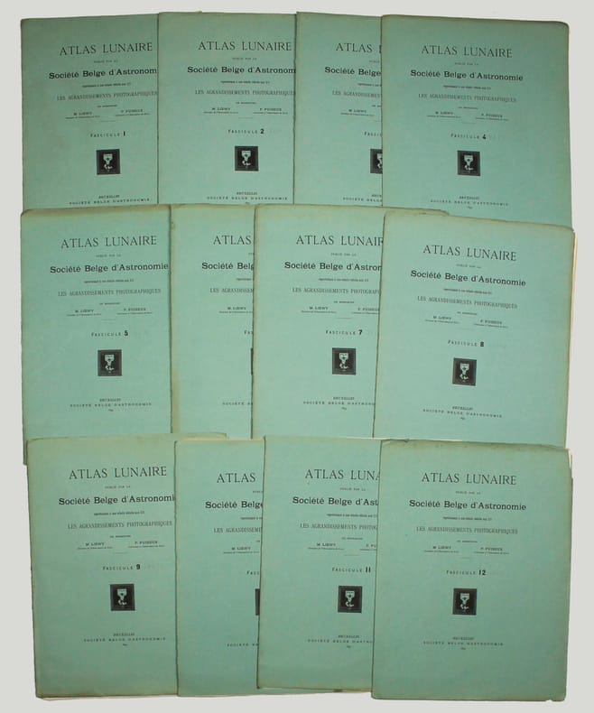 Atlas de 71 planches photographiques tirées en photogravure, chacune est accompagnée d'une serpente légendée. Réservée aux membres de la Société belge dastronomie, cette édition est très rare. Cet atlas a été publié une première fois par l' Imprimerie Nationale, à raison d'un fascicule par an, entre 1896 et 1910 et illustré par des héliogravures. Parallèlement, la Société belge dastronomie décidait de publier dans son bulletin une édition réduite des planches. "Elle est destinée aux simples amateurs qui y trouveront des indications précises, autant quaux astronomes de profession qui en feront un vade mecum de leurs observations lunaires. [] Ces planches ne seront pas mises dans le commerce. Néanmoins, chacun de nos membres pourra se procurer pour ses études un exemplaire en tiré à part à raison de 5 fr. par fascicule." (Bulletin de la Société belge dastronomie, 1897-1898, p. 233-234). La Société comptait alors entre 200 et 400 membres. Tous n'ont pas acheté l'atlas, le tirage a donc été très modeste. Maurice Loewy, directeur de lObservatoire de Paris et Pierre-Henri Puiseux mirent plus dune quinzaine dannées pour réaliser ce grand atlas photographique de la Lune. Cinq cents soirées dobservation seront nécessaires aux astronomes pour réaliser près de six mille clichés. Cette carte photographique de la Lune réalisée par Loewy et Puiseux connut une longévité remarquable. Elle fut utilisée en référence durant des dizaines dannées, jusquà larrivée des premières sondes spatiales, dans les années 1960. Exemplaire exceptionnel tel que paru, en 9 fascicules brochés. Il manque la serpente de la planche XXIX, mais on trouve à la place. une serpente avec des légendes à la plume. Cette absence était probablement d'origine et l'amateur qui a reçu cette livraison l'a alors réalisé. On joint trois planches de la Lune en son entier, en héliogravure, de plus petite taille (25 x 18 cm), qui forment une sorte de supplément à cet atlas. Toujours de Loewy et Puiseux et publiées par la Société Belge d'Astronomie, elles sont légendées "Photographie lunaire obtenue à l'Observatoire de Paris", "Atlas lunaire planche A", B, C. Bon exemplaire. /// In-folio, (33 x 26 cm) de titre, 71 planches, 3 planches supplémentaires. Broché, couvertures imprimées, en fascicules. //// Atlas of 71 photographic plates printed using photogravure, each with a printed overlay. Reserved for members of the Belgian Astronomical Society, this edition is very rare. This atlas was first published by the Imprimerie Nationale, at a frequency of one booklet per year, between 1896 and 1910, and illustrated with heliogravures. At the same time, the Belgian Astronomical Society decided to publish a reduced edition of the plates in its bulletin. "It is intended for amateur astronomers, who will find precise information, as well as for professional astronomers, who will use it as a vade mecum for their lunar observations. [...] These plates will not be sold commercially. However, each of our members will be able to purchase a separate copy for their studies at a price of 5 francs per issue." (Bulletin of the Belgian Astronomical Society, 1897-1898, pp. 233-234). The Society had between 200 and 400 members at the time. Not all of them purchased the atlas, so the number of copies printed was very limited. It took Maurice Loewy, director of the Paris Observatory, and Pierre-Henri Puiseux more than fifteen years to compile this large photographic atlas of the Moon. The astronomers spent five hundred evenings taking nearly six thousand photographs. The photographic map of the Moon produced by Loewy and Puiseux was used as a reference for decades, until the arrival of the first space sondes in the 1960s. An exceptional copy as published, in nine bound fascicles. The overlay on plate XXIX is missing, instead there is a overlay with pen-and-ink captions. This absence was probably original, and the amateur who received this delivery realised this at the time. Three smaller plates (25 x 18 cm) of the entire Moon, in heliogravure, are included as a sort of supplement to this atlas. Also by Loewy and Puiseux and published by the Belgian Astronomical Society, they are captioned Lunar photograph obtained at the Paris Observatory, Lunar Atlas Plate A, B, C. Good copy. /// PLUS DE PHOTOS SUR WWW.LATUDE.NET