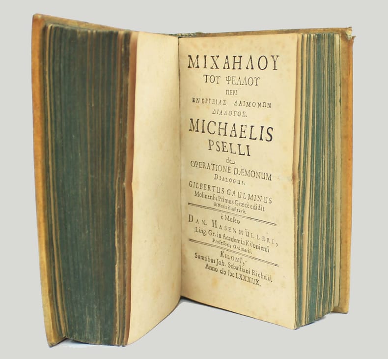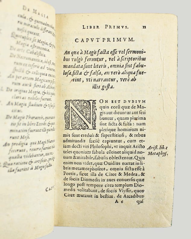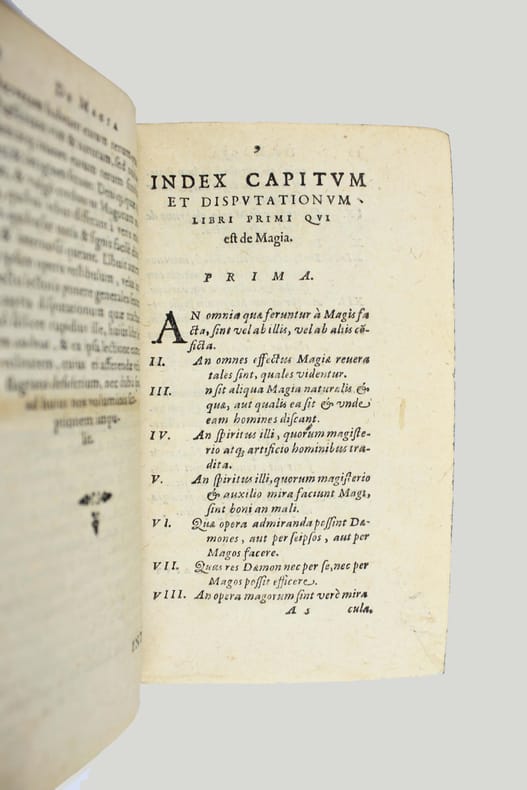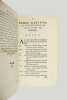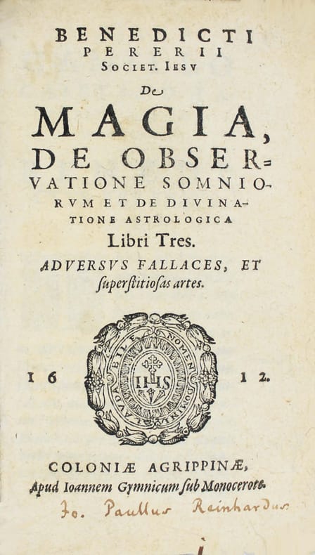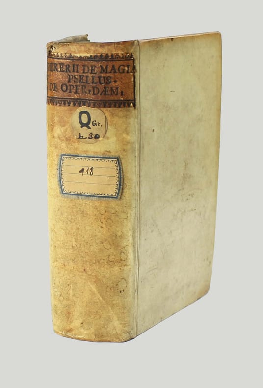 Publié pour la première fois en 1592, l'ouvrage est divisé en trois parties : la première traite des différents aspects de la magie, la deuxième des rêves et de leur interprétation, et la dernière de l'astrologie. Il y fait une distinction nette entre la magie naturelle et la magie diabolique. "Excellent traité de sorcellerie et de magie; il servait également de manuel d'exorcisme." Caillet III, 8518. "L'un de ses chapitres les plus longs est celui consacré à l'alchimie. Après avoir cité des autorités telles qu'Avicenne, Averroès, Thomas d'Aquin, Aegidius, Pierre d'Abano, Cardan, Albert le Grand, Janus Lacinius et Antonius Mirandulanus, qui s'opposent ou se prononcent en faveur de la transmutation, il expose son propre point de vue. Il estime qu'il n'existe aucun argument philosophique décisif contre la transmutation, puisque les animaux sont produits par des incubateurs, tandis que les médicaments et bien d'autres choses sont fabriqués artificiellement. Mais l'échec des alchimistes joue en leur défaveur et conduit à des maux tels que la pauvreté, la contrefaçon et les médicaments nocifs. Même la magie naturelle peut être interdite car son caractère occulte la rend facilement susceptible d'abus. Dans sa partie sur les rêves, Pererius soutient que beaucoup sont vains et futiles, mais que beaucoup d'autres sont également vrais. Certains rêves peuvent être source d'inspiration ou fournir des informations utiles pour entreprendre des actions futures ou acquérir des connaissances dans le domaine des sciences spéculatives." (Thorndike) Le père jésuite Benito Pereira (Valencia, 1535, Rome,1610) a enseigné au Collegium romanum, la physique, la métaphysique et la philosophie. Relié à la suite : PSELLUS [PSELLOS], Michael. De operatione daemonum dialogus. Gilbertus Gaulminus molinensis primus graece editit & notis illustravit. E Museo Dan. Hasenmüller. Kiloni [Keil], Johannes Sebastian Richelius, 1688. In-12 de (12), 166 pp. Texte en grec et traduction latine en regard. On trouve dans ce dialogue sur l'opération des démons, une description des pratiques des Manichéens. "Psellus décrit les pratiques malpropres des Manichéens, qui selon lui goûtaient au commencement de leurs cérémonies les deux excréments et mêlaient de la semence humaine à leurs hosties." (Caillet) Ils communiaient sous les deux espèces, sous forme d'une pâte dans laquelle ils avaient mélangé le sang d'un enfant nouvellement égorgé et de la cendre. Dorbon 3505 (cet exemplaire) : " Réunion de deux ouvrages très rares." Provenances : - Jo. Paullus Reinhardus (ex-libris manuscrit à l'époque sur la page de titre.) - Johann Joseph Anton Freinhueber von Dornwang, churfürstlicher Regierungsrat zu Landshut. 1736. (ex-libris armorié de ce Conseiller électif au gouvernement bavarois). - Dorbon (étiquette imprimée). Petit accroc à la coiffe. Bel exemplaire. /// In-12 de 324, (8) pp., 2 ff. bl. Vélin, tranches bleues. (Reliure de l'époque.) //// First published in 1592, this work contains three parts: the first deals with the different aspects of magic, the second with dreams and their interpretation, and the last with astrology. It makes a clear distinction between natural magic and diabolical magic. An excellent treatise on witchcraft and magic; it was also used as a manual for exorcism. (Caillet). One of his longest chapters is that on alchemy. After quoting such authorities against and in favor of transmutation as Avicenna, Averroes, Aquinas, Aegidius, Peter of Abano, Cardan, and as Albertus Magnus, Janus Lacinius, and Antonius Mirandulanus, he states his own opinion. It is that there is no philosophical argument which is decisive against transmutation, since animals are produced by incubators, while drugs and many other things are made artificially. But the failure of the alchemists to succeed is against them and leads to such evils as poverty, counterfeiting, and harmful medicines. Even natural magic may with some reason be forbidden in the state, since its occult character readily lends it to abuse. In his second book on dreams Pererius holds that many are vain and idle, but many also true. (...) For some dreams one may get inspiration or glean information towards taking future action or acquiring the speculative sciences. (Thorndike VI, 411). The Jesuit priest Benito Pereira (Valencia, 1535, Rome, 1610) taught physics, metaphysics, and philosophy at the Collegium Romanum. Bound with: PSELLUS [PSELLOS], Michael. De operatione daemonum dialogus. Gilbertus Gaulminus molinensis primus graece editit & notis illustravit. E Museo Dan. Hasenmüller. Kiloni [Keil], Johannes Sebastian Richelius, 1688. 12mo, (12), 166 pp. Text in Greek with Latin translation facing. This dialogue on the operations of demons contains a description of Manichaean practices. Psellus describes the unclean practices of the Manichaeans, who, according to him, tasted both excrements at the beginning of their ceremonies and mixed human semen with their hosts. (Caillet) They took communion in both forms, in the form of a paste in which they had mixed the blood of a newly slaughtered child and ashes. Dorbon 3605 (this copy): A collection of two very rare works. Provenance: - Jo. Paullus Reinhardus (contemporary handwritten bookplate on title page). - Johann Joseph Anton Freinhueber von Dornwang, churfürstlicher Regierungsrat zu Landshut. . (armorial bookplate dated 1736 of this elected advisor to the Bavarian government). - Librairie Dorbon (printed label). Small tear to the cap. Fine copy in contemporary vellum binding. /// PLUS DE PHOTOS SUR WWW.LATUDE.NET