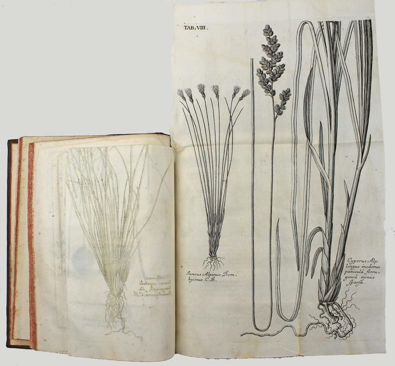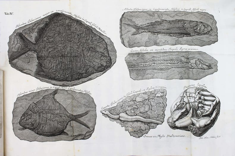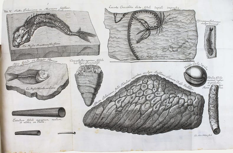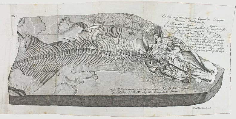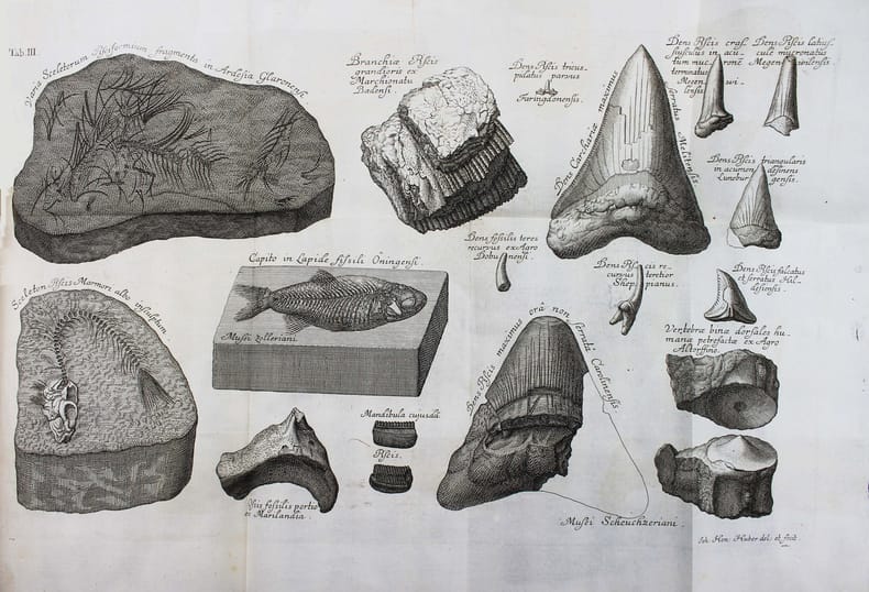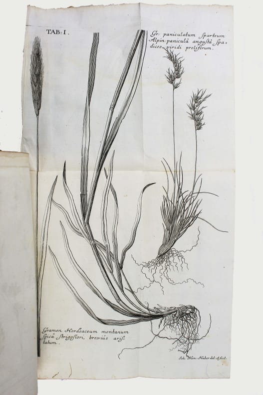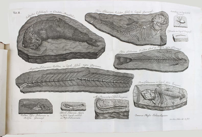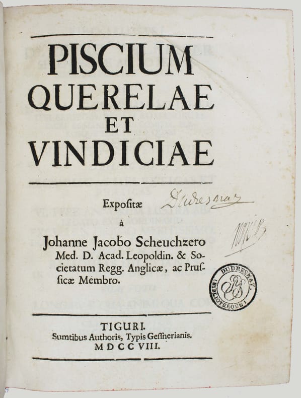 Première édition. Scheuchzer est sans doute le premier à avoir compris que les fossiles étaient les restes d'organismes vivants. Il avait commencé une collection de fossiles dès 1690, qui devint vite célèbre et le mis en contact du monde savant. Il a étudié une grande variété de fossiles et peut être considéré comme le père de la paléontologie européenne. Illustré par 5 belles planches dépliantes gravées de poissons fossiles. Le titre peut se traduire par : "Les doléances et revendications des poissons". Relié à la suite : SCHEUCHZER. Agrostographia, sive, graminum, juncorum, cyperorum, cyperoidum iisque affinium historia. Zurich, Typis et Sumptibus Bodmerianis, 1719. (40), 512, (24) pp., 19 planches gravées. Première édition de cet ouvrage sur les graminées, illustré de 19 planches, dont 8 dépliantes. Nissen BBI 1751. Très bel exemplaire. /// In-4 de (2), 36 pp., 5 planches dépliantes h.-t. Veau marbré, dos à nerfs orné, tranches rouges. (Reliure de l'époque.) //// First edition. Scheuchzer (1672-1733) was the first to understand that fossils were the remains of organic beings and presented the fish themselves as making this case. The fossil collection that Scheuchzer began assembling in 1690 soon became famous and brought Scheuchzer to the attention of the scholarly world. He worked on a great variety of fossils and is considered the founder of European paleontology. The title translates as "The grievances and claims of fishes". Illustrated by 5 beautifull engraved plates of fossils' fishes. Bound with : Agrostographia, sive, graminum, juncorum, cyperorum, cyperoidum iisque affinium historia. Zurich, Typis et Sumptibus Bodmerianis, 1719. (40), 512, (24) pp., 19 plates. First edition of this work on grass, illustrated by 19 engraved plates. Very nice copy in contemporary binding. /// PLUS DE PHOTOS SUR WWW.LATUDE.NET