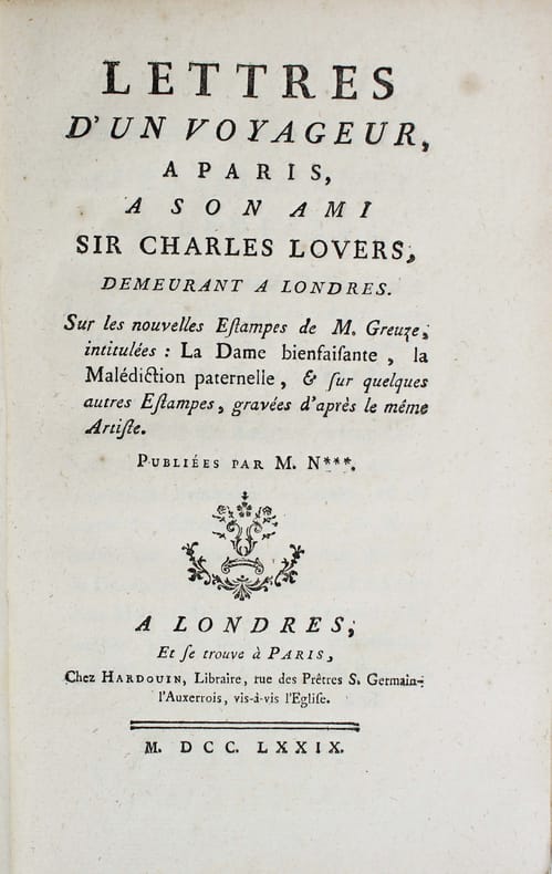 Première édition. Texte anonyme sur plusieurs estampes de Jean-Baptiste Greuze. A la fin catalogue de la libraire Hardouin de 3 pages. Bon exemplaire tel que paru. /// In-8 de 69, (3) pp. Broché, couverture muette de l'époque. //// /// PLUS DE PHOTOS SUR WWW.LATUDE.NET
