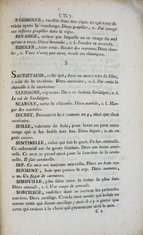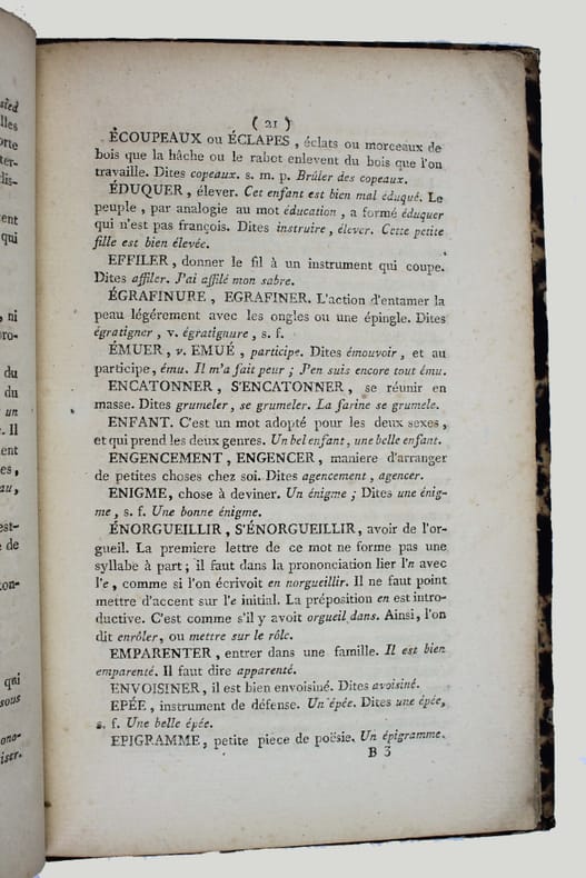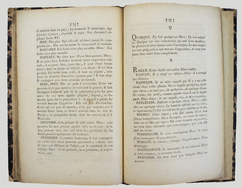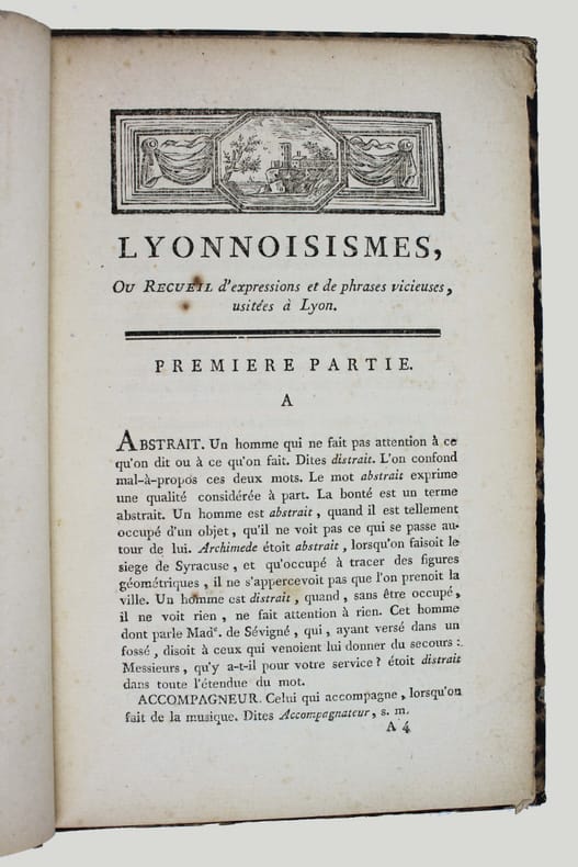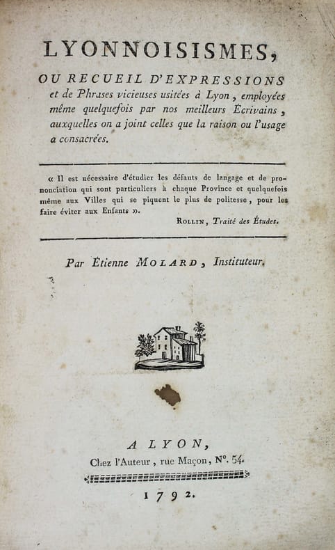 Première édition de ce plaisant dictionnaire. On y apprend qu'un 'pereroux' est un chaudronnier, que 'pitrogner', c'est briser, et que 'résimoler' consiste à cueillir dans une vigne ce qui reste de raisin après la vendange. Etienne Molard, instituteur, a fait paraître trois opuscules sur le "mauvais langage", celui-ci est le premier. Dans les deux suivants, il a élargit son étude au langage parlé dans toute la France : 'Dictionnaire grammatical du mauvais langage, ou recueil des expressions et des phrases vicieuses usitées en France, et notamment à Lyon' (1803) et 'Le mauvais langage corrigé' (1810). Ces "Lyonnoisismes" sot les plus rares, le Ccfr ne recence que des exemplaires à la BM de Lyon. Le faux-titre n'a pas été conservé par le relieur. Des corrections à la plume, très certainement de la main de l'auteur page 10, et 2 et 8 du supplément. Bon exemplaire. /// In-8 de 59, (1), 8 pp. Demi-percaline. (Reliure du XIXe.) //// /// PLUS DE PHOTOS SUR WWW.LATUDE.NET