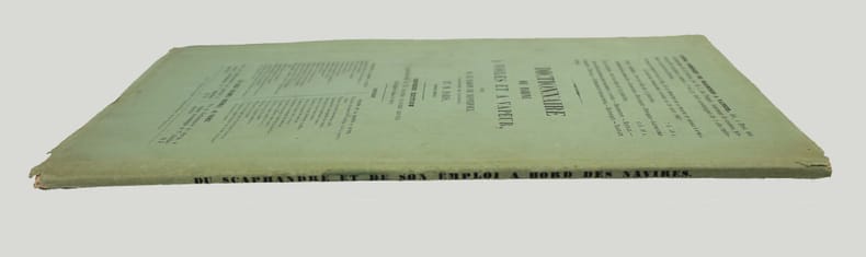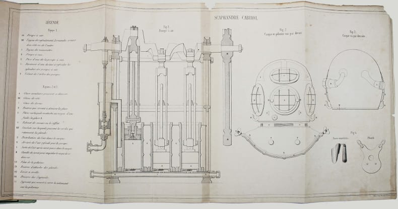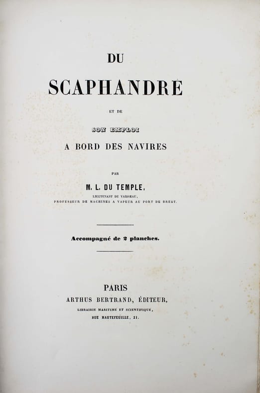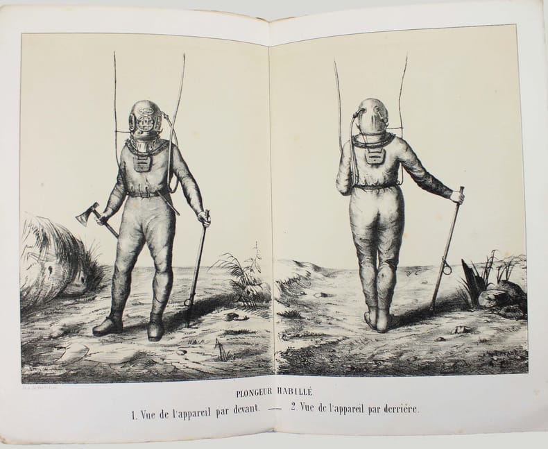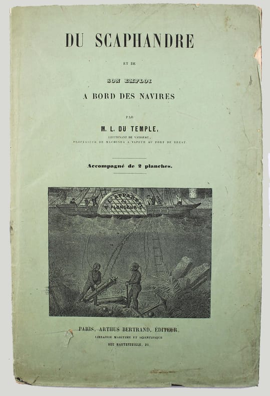 Première édition. Illustré par une vignette gravée sur la couverture, une belle planche sur double page représentant le scaphandrier et une grande planche dépliante montrant des détails du scaphandre "Cabirol". Jolie plaquette imprimée sur beau papier. Une petite déchirure en marge de la planche dépliante. /// In-8 de 30, (2) pp., 2 planches h.-t. Broché, couverture imprimée. //// First edition. Illustrated with an engraved vignette on the cover, one beautiful double-page plate depicting the diver, and a large folding plate showing details of the Cabirol diving suit. A lovely booklet printed on high-quality paper. There is a small tear along the edge of the fold-out plate. /// PLUS DE PHOTOS SUR WWW.LATUDE.NET