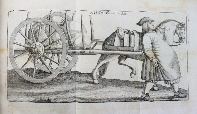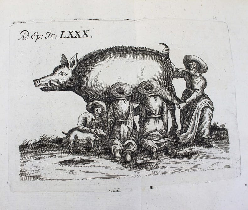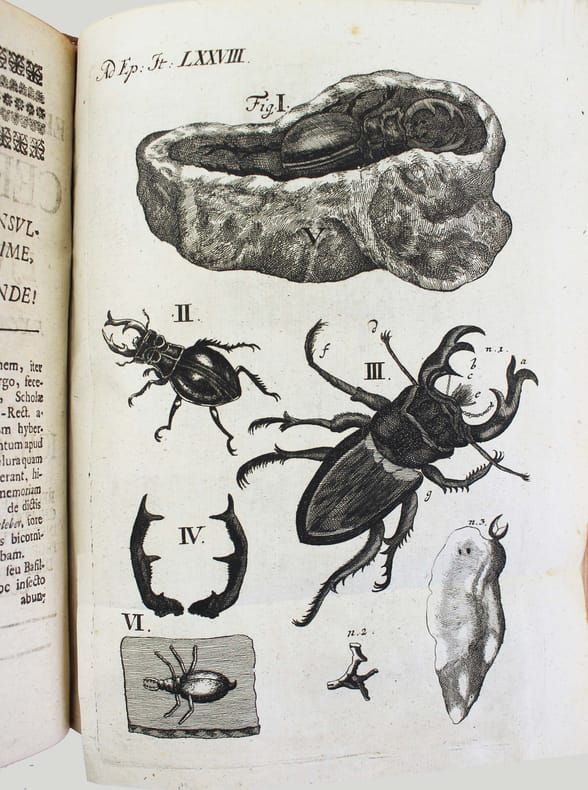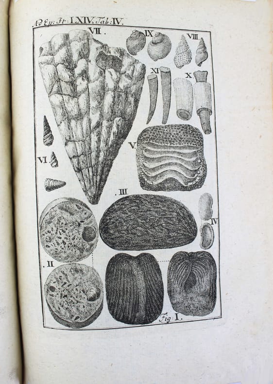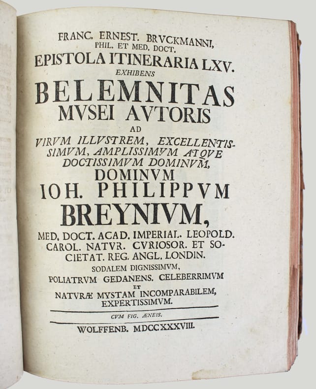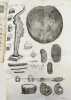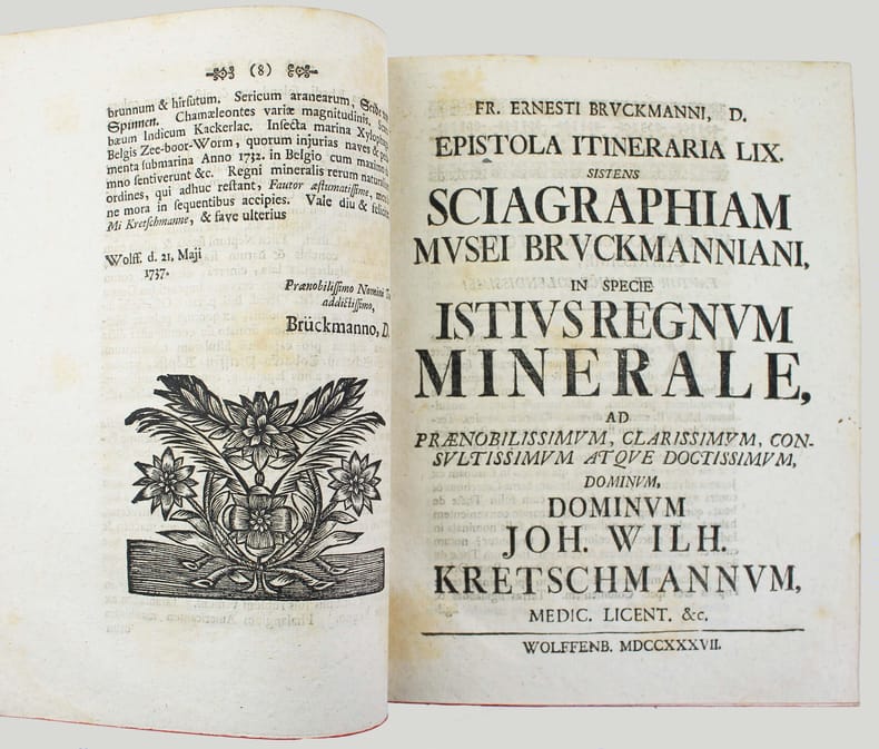 Première édition. "Epistola itineraria" de 51 à 100 et 3 suppléments. Ces 53 fascicules sont illustrés de 64 planches, certaines dépliantes. Franz-Ernest Bruckmann (1697-1753) publia séparément 100 lettres de 1728 à 1741, sur ses voyages en Allemagne et en Hongrie, où il rend compte des curiosités de la nature qu'il a pu observer. Il s'intéresse apparemment à tout : les cabinets de curiosités, la minéralogie, les fossiles, la botanique, les monstruosités humaines ou animales, les reliques du passé... De manière évidente, on ne trouve jamais cette série de lettres complète. De plus, il publia une autre "centurie" en 1749 et une autre, éditée à titre posthume en 1756. Aucune bibliothèque au monde ne possède l'intégralité les "lettres" de cet auteur prolifique, qui était avant tout un esprit curieux. Divers suppléments ont été reliés à la fin. Contenu : Epistola itineraria 51. Sistens memorabilia Musei Lesseriani. (12) pp. - 52. De mumia Brunsvicensium. 32 pp., 1 pl. - 53. De signis urbium mnemonicis. 12 pp., 9 pl. - 54. Signa urbium mnemonica. 12 pp. - 55. Reliqua urbium et locorum signa mnemonica. 12 pp. - 56. Catalogum fossilium figuratorum Guelpherbytensium.13 pp., 1 pl. - 57. Sciagraphia musei Bruckmanniani. 12 pp. - 58. Sciagraphia musei Bruckmanniani. 8 pp. - 59. Sciagraphiam musei Bruckmanniani, in specie istius regnum minerale. 8 pp. - 60. Sciagraphiae musei Bruckmanniani partem alteram de artefactis. 12 pp., 1 pl. - 61. Memorabilia Tyrnaviensia. 12 pp., 1 pl. - 62. Notas quasdam et animadversiones in Caspari Bauhini prodromum theatri botanici. 12 pp. - 63. Notas quasdam et animadversiones in Guil. Pisons et Jac. Bontii libros. 8 pp.- 64. De lapidibus figuratis quibusdam rarioribus. 15 pp., 5 pl. - 65. Exhibens belemnitas musei autoris. 24 pp., 5 pl. - 66. De pane daemonum.16 pp., 1 pl. - 67. De pane febrifugo St. Nicolai. 16 pp., 2 pl. - 68. Sistens memorabilia Neoburgica et panem fustibus verberandum. 8 pp., 1 pl. - 69. Sistens Gazophylacium lapidum pretiosorum silesiacorum. 20 pp. - 70. De pane dactylorum, St. Marci nec non ex Marga Candida. 8 pp.- 71. Chamaecerasmum hungaricum et salicem orientalem Davidis. 12 pp., 1 pl. - 72. De sylvae Hercynicae antris. 12 pp., 1 pl. - 73. Memorabilia Montis regii in Hungaria. 8 pp., 1 pl. - 74. Memorabilia Schemnicensia in Hungaria. 12 pp., 1 pl. - 75. Memorabilia Cremnicensia in Hungaria. 31 pp. - 76. Memorabilia Neosoliensia in Hungaria. 12 pp. - 77. Antra draconum Liptoviensia. 16 pp., 1 pl. - 78. De cervo volante et ejus hybernaculo. 12 pp., 1 pl. - 79. De signis urbium mnemonica. 12 pp., 4 pl. - 80. Signa urbium mnemonicis. 12 pp., 1 pl. - 81. Museum metallicum autoris sistens. 16 pp. - 82. Museum metallicum autoris sistens. 16 pp., 1 pl. - 83. Museum metallicum autoris exhibens.12 pp., 1 pl. - 84. Museum metallicum autoris. 28 pp., 2 pl. - 85. Plantas quasdam Hercynicae sylvae. 15 pp., 1 pl. - 86. Sistens corollarium ad relationem historico-curiosam de iterato itinere in Hercyniae montem. 16 pp., 9 pl. - 87. Memorabilia comitatus Liptoviensis in Hungaria. 7 pp. - 88. Memorabilia Kesmarkina in Hungaria. 8 pp. - 89. Montes Carpatios in Hungaria. 27 pp., 1 pl. - 90. Memorabilia Leutschoviensia et Dobschinensia. 8 pp. - 91. Memorabilia Szomolnokcensia. 8 pp. - 92. Memorabilia Epericensia. 8 pp., 1 pl. - 93. Salis-fodinas Soowarienses. 7 pp. - 94. Memorabilia St. Ivan. 7 pp. - 95. De incendio Restiguendo. 8 pp. - 96. Memorabilia Trincinenensia. 11 pp., 2 pl. - 97.Vina Hungarica. 12 pp. - 98.Pannoniae aquas mineralis. 12 pp. - 99. Memorabilia Hungaria 32 pp., 2 pl. - 100. Scriptores rerum Hungaricarum. 15 pp. - BUCHNER. Epistola de memorabilibus Voigtlandiae subterraneis. 1752. 8 pp. - RITTER. Relatio historico-curiosa de iterato itinere in Hercyniae montem famosissimum bructerum. 1740. 56 pp., 5 planches. - Supplementum ad F. E. Bruckmanni D. centuriam Epistolarum Itinerarium. 48 pp., 1 pl. - index de (44) pp. La reliure est frottée, les coiffes et charnières sont usées, mais elle est encore solide. Provenance : exlibris armorié de Jean Philippe Boecler (1710-1759) médecin, philosophe et botaniste de Strasbourg. /// in-4 de Basane marbrée, dos à nerfs orné, tranches rouges. (Reliure de l'époque.) //// First edition. Epistola itineraria from 51 to 100 and 3 supplements. These 53 fascicles are illustrated with 64 plates, some of which are fold-outs. Franz-Ernest Bruckmann (1697-1753) published 100 letters separately between 1728 and 1741, recounting his travels in Germany and Hungary, where he described the curiosities of nature he observed. He was apparently interested in everything: cabinets of curiosities, mineralogy, fossils, botany, human and animal monstrosities, relics of the past... Obviously, this series of letters has never been found in its entire collection. In addition, he published another century in 1749. One more was published posthumously in 1756. No library in the world has the complete letters of this prolific author, who was above all a curious mind. Various supplements have been bound at the end. The binding is rubbed, the caps and hinges are worn, but this copy is still sturdy. Provenance: armored bookplate of Jean Philippe Boecler (1710-1759), physician, philosopher, and botanist from Strasbourg. /// PLUS DE PHOTOS SUR WWW.LATUDE.NET