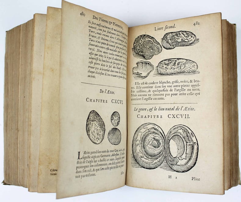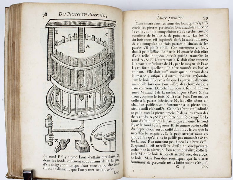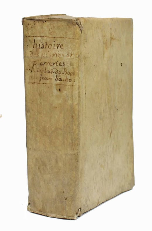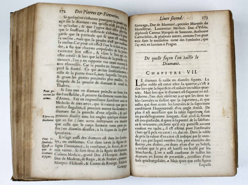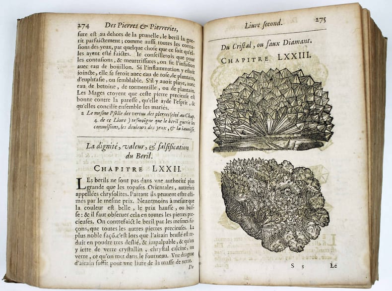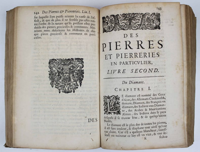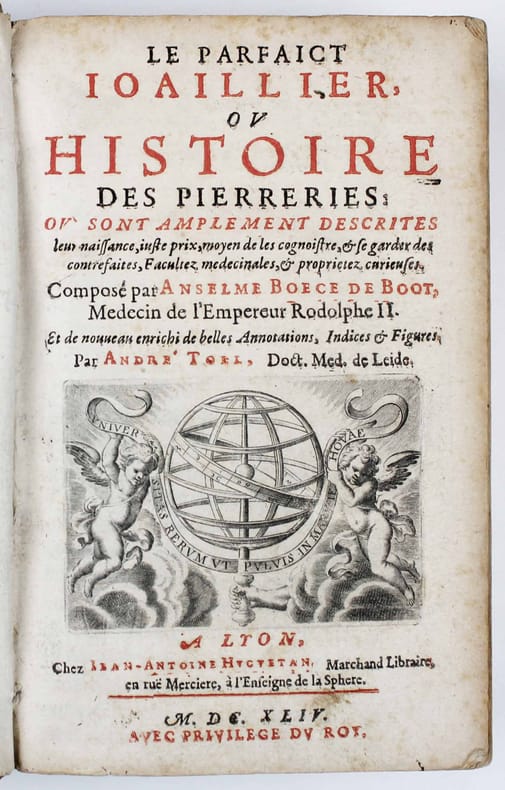 Première édition en français du "Gemmarum et Lapidum historia", ouvrage de la plus grande importance pour l'histoire de la minéralogie et de la gemmologie. Boodt a tenté la première classification des minéraux. Il en connaît près de 600 et décrit leurs propriétés, leur valeur leur usage médical. Illustré par 43 bois gravés dans le texte et 2 tableaux dépliants. Les gravures montrent des pierres, des cristaux, des machines pour tailler et polir les pierres précieuses et même des fossiles. La traduction est de Jean Bachou. Papier très légèrement bruni, bel exemplaire. Provenance : Joseph Xaupi (ex-libris armorié gravé, quelqu'un a collé son ex-libris, une autre personne l'a retiré et l'ex-libris de Xaupi est un peu déchiré). DSB 2, 293. Ward, Carrozzi 254. /// In-8 de (32), 746, (36) pp., 2 tableaux dépl. hors-texte. Vélin. (Reliure de l'époque.) //// First French edition of Gemmarum et Lapidum historia, a work of utmost importance for the history of mineralogy and gemology. Boodt attempted the first classification of minerals. He knew nearly 600 of them and described their properties, value, and medical uses. Illustrated with 43 woodcuts in the text and two fold-out tables. The engravings show stones, crystals, machines for cutting and polishing precious stones, and even fossils. Translated by Jean Bachou. Paper slightly browned, a fine copy. Provenance: Joseph Xaupi (engraved armorial bookplate, someone stuck their bookplate on it, another person removed it, and Xaupi's bookplate is slightly torn). DSB 2, 293. Ward, Carrozzi 254. /// PLUS DE PHOTOS SUR WWW.LATUDE.NET