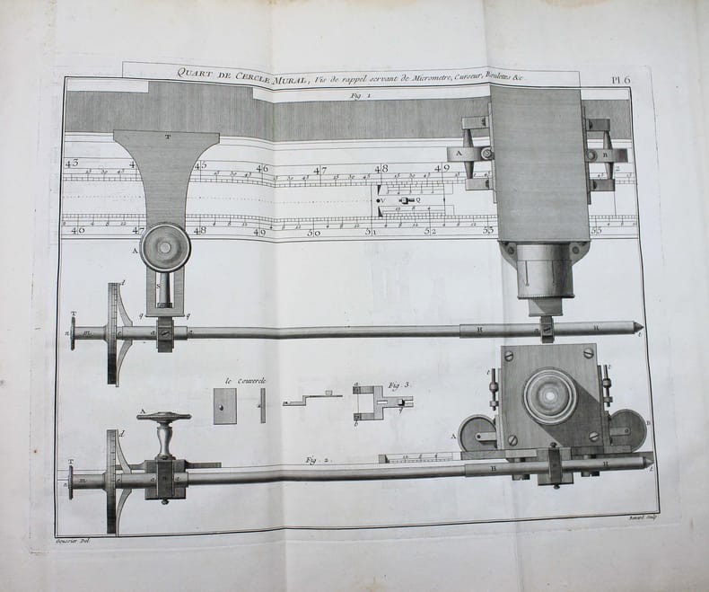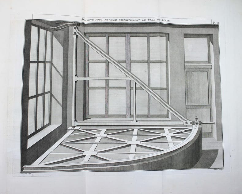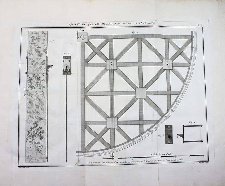 Première édition. Elle a été publiée par l'Académie des Sciences dans la série de la "Description des Arts et Métiers". Illustré par 14 belles planches gravées sur cuivre dépliantes. Pierre-Charles Le Monnier (1715-1799), astronome privilégié de Louis XV, est rentré très jeune à l'Académie des Sciences et faisait parti, avec Maupertuis et Clairaut, de l'expédition en Laponie de 1736 à 1737 pour mesurer la longueur d'un degré de méridien. Voir la longue notice que Jérome de Lalande, qui a été son élève, consacre à la vie et aux travaux de Le Monnier, Biblio. astronomique pp. 819-826. DSB 8, 178. Papier très légèrement bruni; exemplaire grand de marges. /// In-folio de IV, 60 pp.,14 planches. Cartonnage papier éponge postérieur. //// First edition. Illustrated by 14 folding engraved plates.