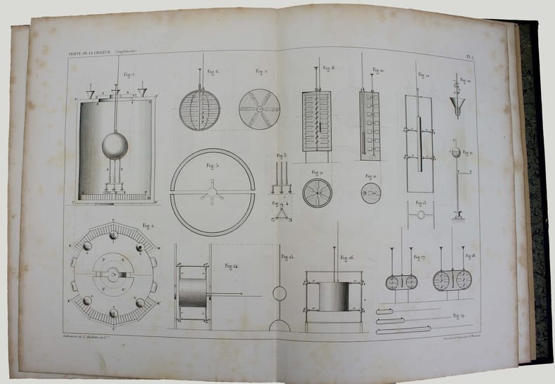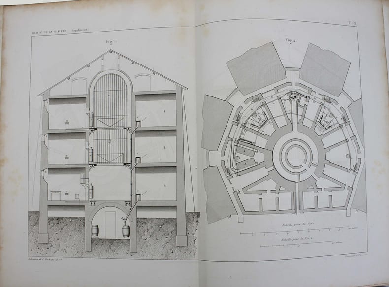 Chauffage et ventilation de prisons, de l'église saint-Roch, du grand amphitéâtre du Conservatoire des Arts et Métiers, de la salle des séances de l'Institut, de l'hôpital du Nord, du dépôtoir de la Villette et des ateliers de cristallerie de Baccarat. Envoi de l'auteur sur la page de titre: "A Mr. Trescat". Illustré de 8 planches sur double-page. Quelques rousseurs, coiffes frottées. /// In-4 de (6), 172, (4) pp., 8 planches. Demi-basane verte, dos orné. (Reliure de l'époque.) ////