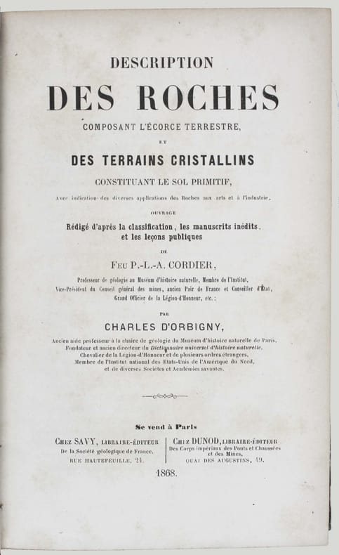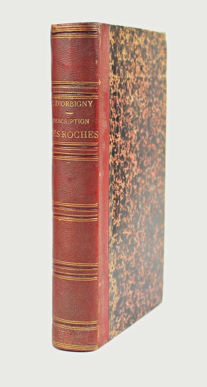 Première édition. Rédigée par d'Orbigny, d'après la collection, la classification, les manuscrits inédits et les cours au Muséum de Pierre-Louis-Antoine Cordier (1777-1861), dont Charles d'Orbigny a été l'assistant pendant 28 ans. Cordier a été le premier à utiliser le microscope polarisant en minéralogie. En fin d'ouvrage est reproduit son important mémoire lu à l'Académie "Sur les substances minérales dites en masses, qui entrent dans la composition des roches volcaniques de tous les âges." Il y montre que les laves modernes et anciennes ont la même composition. "An important step in the basalt contreversy." DSB 3, 411. Quelques légères rousseurs. /// In-8 de XVI, 553, (1) pp., 1 tabl. dépl. Demi-chagrin rouge, dos à nerfs orné. (Reliure de l'époque.) ////