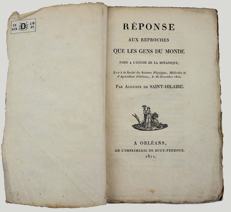 Première édition. Jolie dissertation sur la botanique, son histoire, ses "découvreurs"... Le botaniste Auguste de Saint-Hilaire séjourna par la suite 6 ans au Brésil et en ramena 24000 espèces de plantes. Ce texte a été publié dans le Bulletin des sciences physiques, médicales, et d'agriculture d'Orléans. Bon exemplaire de ce tiré à part, non coupé. DSB 12, 72. Pritzel 7283./// In-8 de 30 pp. Broché, couverture muette de l'époque. ////