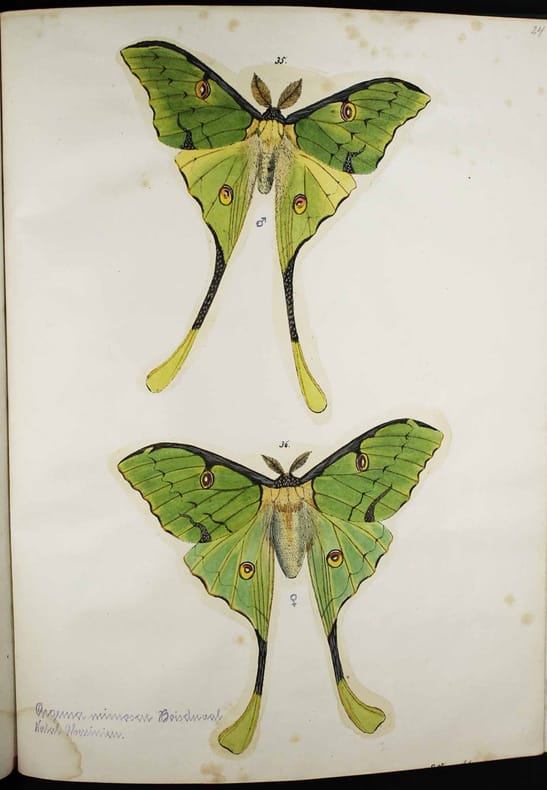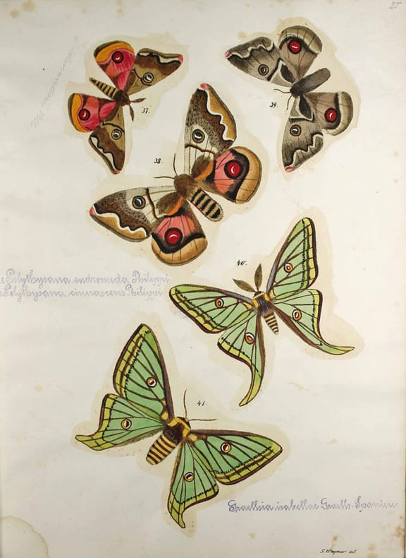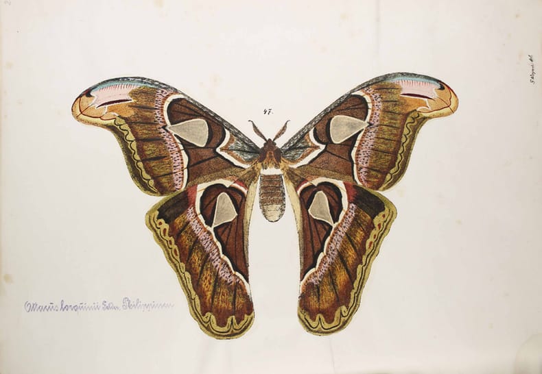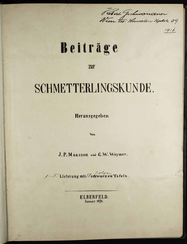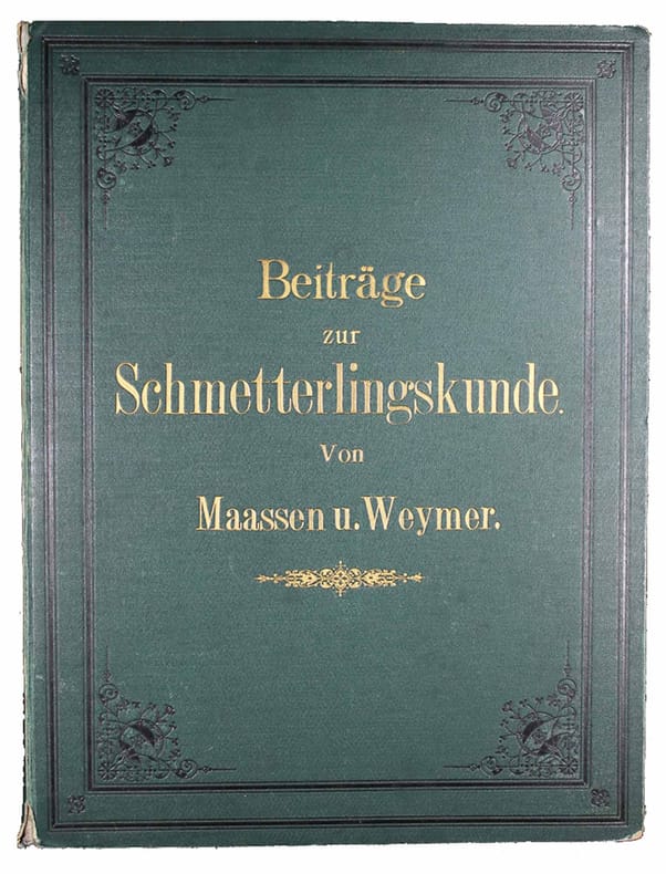 Seule édition. Illustré par 50 planches coloriées à l'époque. Nissen 2620./// In-folio de titre, 50 planches, 4 feuillets de texte. Percaline verte, titre doré sur le premier plat. (Reliure de l'éditeur.) //// Only edition. Illustrated with 50 plates in lithography. All contempory hand colored. Published in 5 issues from 1869 to 1885, this is one of the rarest books on lepidoptera.