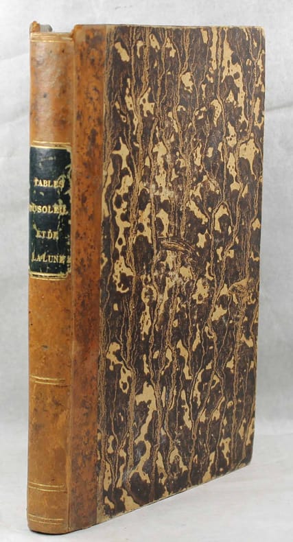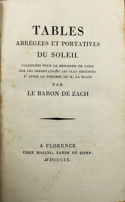 Edition originale. Ces tables portatives sont celles que l'auteur a publiées à Gotha 1792 et 1804. Mais elles sont revues, corrigées et réduites pour satisfaire "l'astronome voyageur". Astronome du Duc Ernst II de Saxe-Cobourg jusqu'en 1806, Zach séjourna en Italie avec la Duchesse de Saxe-Cobourg et publia ces deux ouvrages durant son séjour à Florence. Coiffe rognée, une piqûre de vers sur les 15 derniers feuillets sans dommage pour la lisibilité. Timbre sec de "L. J. Beauval, géomètre" qui a écrit quelques notes dans les marges. /// In-8 de VII, 67, (3) / XIV, 80 pp. Demi-basane fauve, dos orné. (Reliure de l'époque.) ////