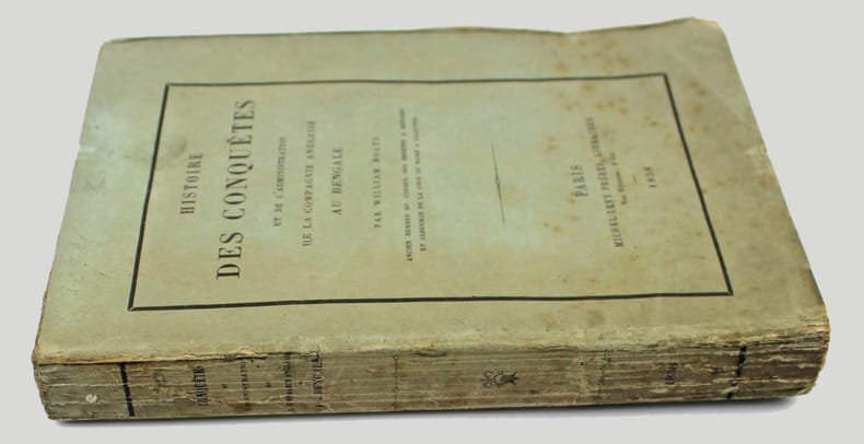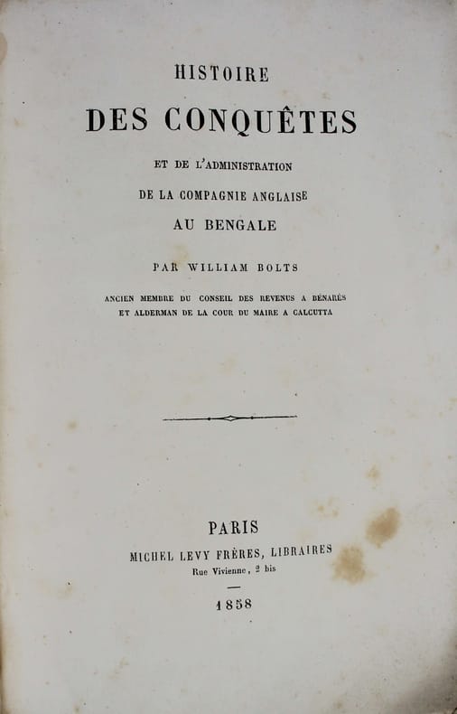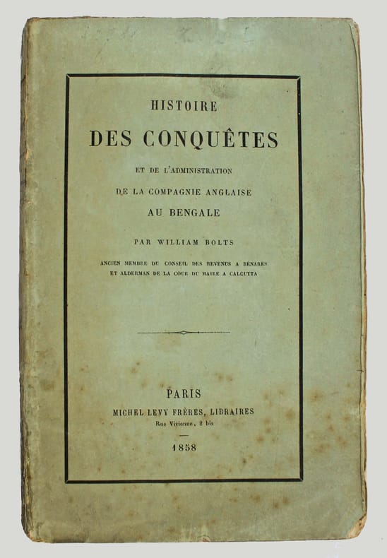 Réédition de ce célèbre ouvrage, dans la traduction de Jean-Nicolas Démeunier, donnée opportunément à l'occasion de la révolte des Cipayes, soulèvement populaire qui eut lieu en Inde en 1857 contre la Compagnie anglaise des Indes orientales.Marchand hollandais, William Bolts (17381808) dénonçait, dans cet ouvrage, l'exploitation et la spoliation du Bengale par la Compagnie britannique des Indes orientales. "Les observations qu'il relate sont une source unique pour les études sur la nature de la domination britannique au Bengale".Bel exemplaire, très frais, imprimé sur beau papier, entièrement non coupé, tel que paru.