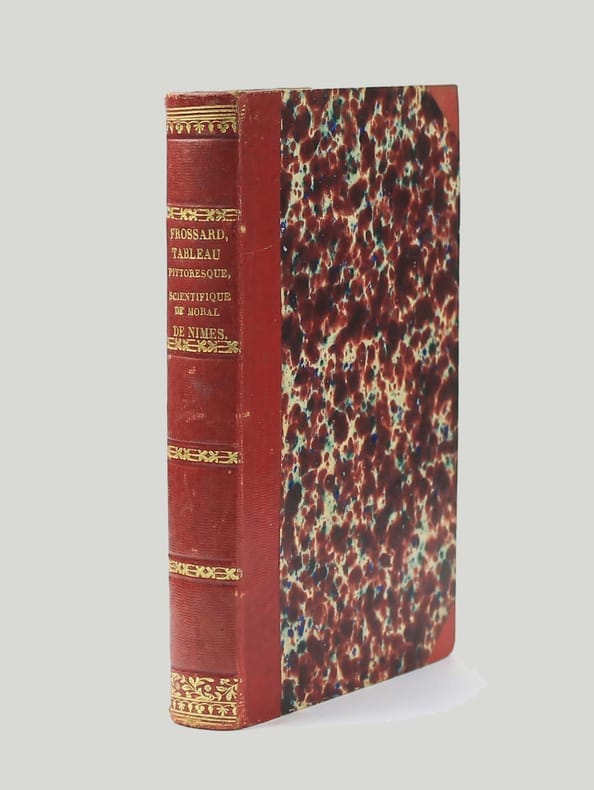Première édition. Un des rares exemplaire en couleurs. Il est illustré par 2 frontispices, 94 planches, dont 3 dépliantes et 7 gravures à mi-page. Toutes sont des lithographies et la majorité ont été délicieusement coloriées à l'aquarelle. Complet des trois parties, dont le supplément. Dans cette description du Gard mais aussi du Vaucluse et de l'Hérault, on trouve les sujets les plus variés : les baux de Provence, les Arènes, le rollier, le flamant, les bohémiens, l'ascension du Mont-Ventoux, les Quakers de Congéniès, Nostradamus, Avignon, Uzès, grottes de Gange, Montpellier, ascension du Pic Saint-Loup, Arles, la mante religieuse, le Vigan, etc ... Le pasteur Emilien Froissard est un des fondateurs la société Ramond pour l'étude scientifique des Pyrénées. Il a aussi publié deux ouvrages sur les Pyrénées qui sont illustrés dans le même style. La charmante illustration de ce volume ne laissera pas indifférent tout amateur de lithographie. L'exemplaire de la Bibliothèque Nationale, et tous ceux que nous avons pu repérer sont en noir. Dans celui-ci, plus de la moitié des illlustrations sont en couleurs. Papier des planches inévitablement bruni, mais bon exemplaire. /// In-8 de frontispice, VIII, 160 pp. / frontispice, XII, 232 pp. / (4), 104 pp. Demi-chagrin bleu, dos à nerfs. (Reliure de l'époque.) //// First edition. One of the few copies in color. It is illustrated with 2 frontispieces, 94 plates, including 3 folding plates and 7 mid-page engravings. All are lithographs, and most have been exquisitely colored in watercolor. Complete with all three parts, including the supplement. This description of the Gard, Vaucluse and Hérault regions covers a wide range of subjects: Baux de Provence, Arènas, the flamingo, the gypsies, ascent of Mont Ventoux, the Quakers of Congéniès, Nostradamus, Avignon, Uzès, caves of Gange, Montpellier, ascent of Pic Saint-Loup, Arles, le Vigan, etc... Pastor Emilien Froissard is one of the founders of the Ramond Society for the Scientific Study of the Pyrenees. He has also published two books on the Pyrenees, illustrated in the same style. The charming illustrations in this volume will not leave any lithography enthusiast indifferent. The Bibliothèque Nationale copy, and all the others we've been able to locate, are in black. In this one, more than half the illustrations are in color. Paper of the plates inevitably browned, but a good copy.