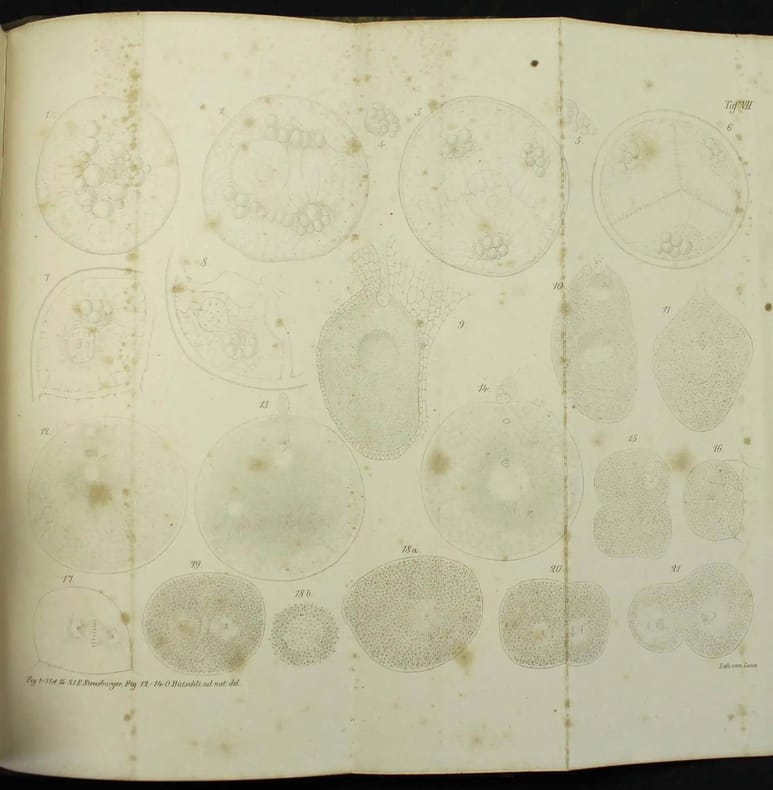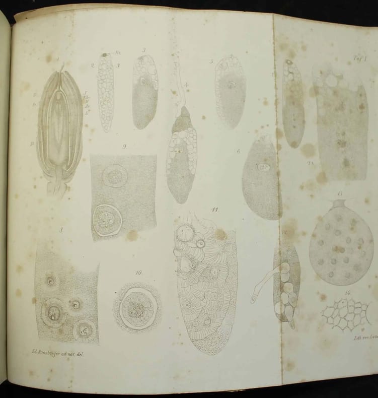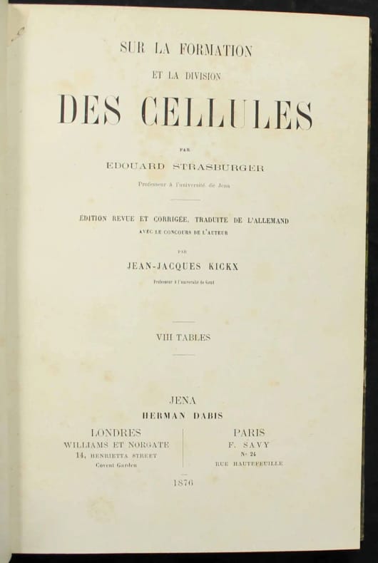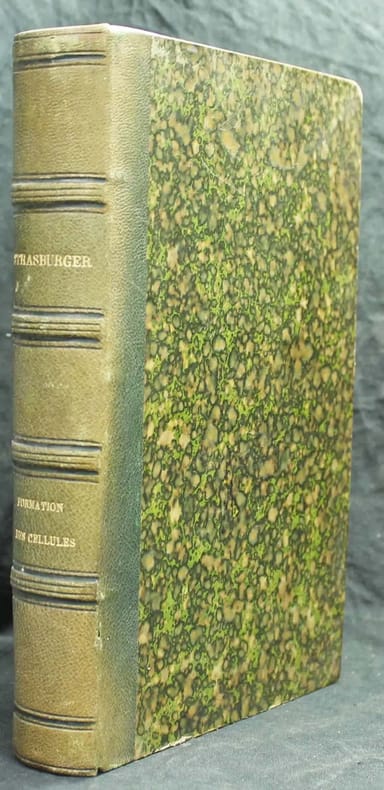 Première édition en français du "Zellbildung und Zelltheilung". Elle a été corrigée et augmentée sur la première allemande (1875). L'auteur nous dit dans sa préface qu'il a pour cette édition redessiné deux planches et ajouté un nouveau chapitre. Il décrit avec beaucoup de précision dans son ouvrage les processus que comporte la division des cellules."Strasburger clarified the phenomena of cell division and the role of the nucleus and chromosomes in heredity. (...) During his twelve years at Jena, Strasburger published his botanical investigations. The development of his cytological observations can be followed in the three editions of his "Zellbildung und Zelltheilung" (1875, 1876, 1880). (...) He had been active in research and teaching for nearly fifty years and had linked his extensive botanical and cytological observations to the solution of central problems of heredity and evolution". DSB 13, 90. Couleur du dos passée, rousseurs minimes aux planches. /// In-8 de XIV, (2), 307 pp., 8 planches dépliantes hors-texte. Demi-chagrin vert, dos à nerfs, tranches mouchetées. (Reliure de l'époque.) ////