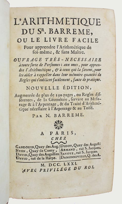 Ouvrage très nécessaire a toute sorte de personnes aux unes, pour apprendre l'arithmétique & à ceux qui la scavent pour les aider à rappeller dans leur mémoire quantité de regles qui s'oublient facilement faute de pratique - Nouvelle édition augmentée de plus de 190 pages ou regles différentes de la géométrie, servant au mesurage & à l'arpentage & du traité d'arithmétique nécessaire à l'arpentage & au toisé - NOTA : François Barrême né à Tarascon le 7 juillet 1638 et mort à Paris en 1703, est un mathématicien français, considéré comme l'un des fondateurs de la comptabilité. Classification Dewey : 840.05-XVIII ème siècle