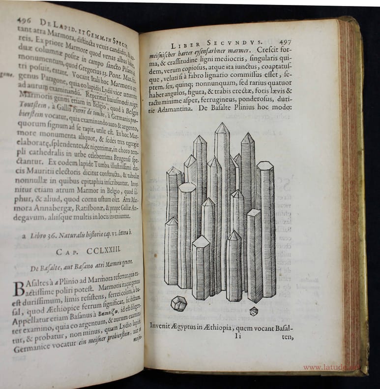 Seconde édition; la première augmentée des commentaires d'Adrian Toll. Ouvrage de la plus grande importance pour l'histoire de la minéralogie et de la gemmologie. Boodt a tenté la premier de classer les minéraux. Il en connaît près de 600 et décrit leurs propriétés, leur valeur et leur usage médical. Illustré par 43 bois gravés dans le texte et 2 tableaux dépliants. Les gravures montrent des pierres, des cristaux, des machines pour tailler et polir les pierres précieuses et même des fossiles. Provenance : signature de l'époque sur la page de titre : "Ex catalogo librorum Eberbardi (?)". Quelques passages soulignés par la même plume. Coins usés, quelques feuillets légèrement brunis. Bon exemplaire dans l'ensemble. DSB 2, 293. Ward, Carrozzi 252./// In-8 de (8), 576, (22) pp., 2 tabl. dépl. hors-texte. Vélin à rabats. (Reliure de l'époque.) //// Second edition. Published after De Boodt's death, this is the first one with Leiden physician Adrian Toll's commentaries. Illustrated by 43 woodcuts in text. "In his Gemmarum et Lapidum Historia, Boodt made the first attempt at a systematic description of minerals, dividing the minerals into great and small, rare and common, hard and soft, combustible and incombustible, transparent and opaque. He uses a scale of hardness expressed in three degrees and notes the crystalline forms of some minerals (triangular, quadratic, and hexangular). Boodt criticizes some of the views of Aristotle, Pliny, Paracelsus, and others. He also mentions atoms. He enumerates about 600 minerals that he knows from personal observation, and describes their properties, values, imitations, and medical applications. There are also tables of values of diamonds according to their size and a short description of the polishing of precious stones. Boodt cites nineteen authors and, besides the minerals known to him, gives a list of 233 minerals whose names he knows from Pliny and Bartholomeus Anglicus, among others." D.S.B. 2, 293. Contemporary vellum.