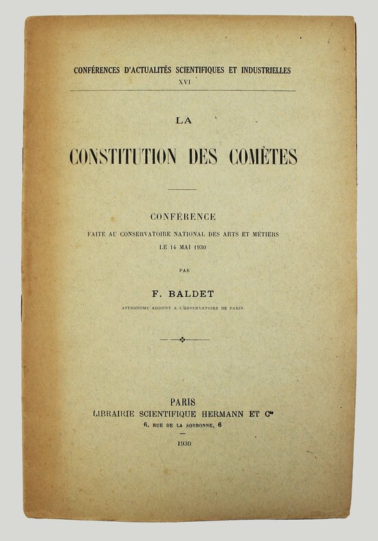 Paris, Librairie Scientifique Hermann et Cie, 1930, in-8, 23 pp, 1 pl, Broché, couverture imprimée, Des Conférences d'actualités scientifiques et industrielles, XVI : Conférence de Fernand Baldet (1885-1964), astronome à l'Observatoire de Paris, faite au Conservatoire national des arts et métiers le 14 mai 1930. Une planche présente les photographie de spectres de comètes obtenues au prisme-objectif. La planche a été découpée en son milieu : manque de texte, mais pas d'atteinte à l'illustration. Couverture rigide