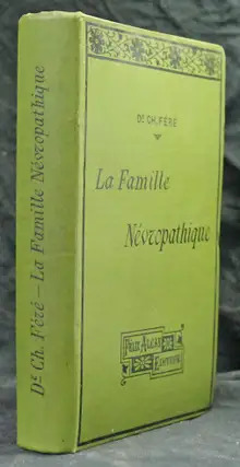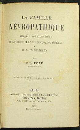 Paris, F. Alcan, 1894, in-12, (4), 334, (2)pp, percaline verte imp. (Rel. de l'éd.), PREMIÈRE ÉDITION. Interne et secrétaire particulier de Jean Martin Charcot à la Salpêtrière en 1881, puis médecin en chef du laboratoire de Bicêtre à partir de 1887, Charles Féré (1852-1907) est l'auteur de nombreux ouvrages sur la médecine, la psychologie, la sexualité et la criminalité. Charcot s'était penché sur l'importance et les conséquences de l'hérédité chez les patients atteints de troubles mentaux, l'expression "famille névropathique" apparaît néanmoins la première fois dans un article de Féré (Archives de neurologie, 1884) ensuite dans la thèse d'agrégation de Jules Déjerine (l'Hérédité dans les maladies du système nerveux, 1886) que Féré cite dans le présent ouvrage. Ouvrage de référence sur le sujet, illustré de nombreuses reproductions photographiques dans le texte. En partie non coupé. Couverture rigide