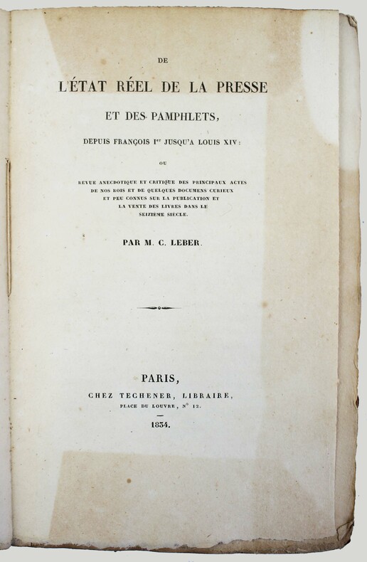 Édition originale. Réfutation de l'opuscule de Charles Nodier intitulé De la liberté de la presse avant Louis XIV. Bourquelot, V, 5. Bel exemplaire dans sa couverture d'origine.