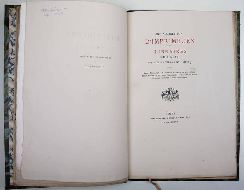 Importante et rare contribution sur l'étude des imprimeurs réfugiés à Tours pendant la Ligue, grâce à la découverte par le docteur Giraudet d'un contrat d'association les liant entre eux. Ouvrage de référence soigneusement imprimé sur papier vergé, qui ne fut tiré qu'à 175 exemplaires (n°40).