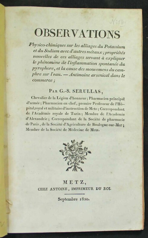 Suivi de: SERULLAS. Second mémoire sur les alliages du potassium et sur l'existence de l'arsenic dans les préparations antimoniales usitées en médecine. Metz, Antoine, Mai 1821. In-8 de (2)-44-(1) pp. C'est la suite du mémoire précédent. Georges-Simon Serullas a été professeur et chef pharmacien au Val de Grâce, professeur de chimie au jardin des Plantes, et membre de l'Académie des Sciences. Ces deux mémoires sont la suite des expériences entreprises par Vauquelin sur l'antimoine. Rare. Manquent à Duveen, Cole, Ferguson; DSB 12, 321. Suivi de: SERULLAS. Charbon fulminant. (Paris, Huzard, Septembre 1821, tiré à part du "Recueil des mémoires de médecine, de chirurgie et de pharmacie militaire) 8 pp. /// In-8 de (2), 64 pp. Broché, couv. papier moderne. ////