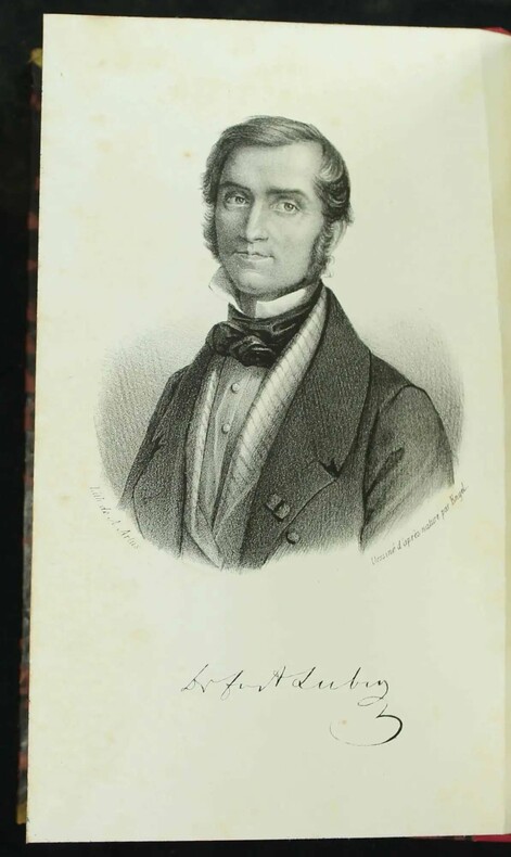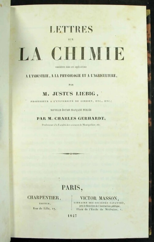 Illustré par un portrait frontispice dessiné d'après nature par Engel et lithographié par Artus. Nouvelle édition française publiée par M. Charles Gerhardt. Recueil de 26 lettres qui vont de l'objet de la chimie à son application à l'agriculture tout en évoquant ses rapports à la physiologie et à l'industrie en général. "In 1862, Liebig completed and expanded seventh edition of his "Chemistry in Its Applications to Agriculture and physiology"; the sixth edition had appeared in 1847. The new book was the most comprehensive statement of his views, backed with the most extensive analytical and field data, and it was also his last major scientific endeavor". DSB 347. Bon exemplaire très frais. /// In-12 de Portrait, (4), IV, 284 pp. Demi-basane rouge, dos orné, tranches mouchetées. (Reliure de l'époque.) ////