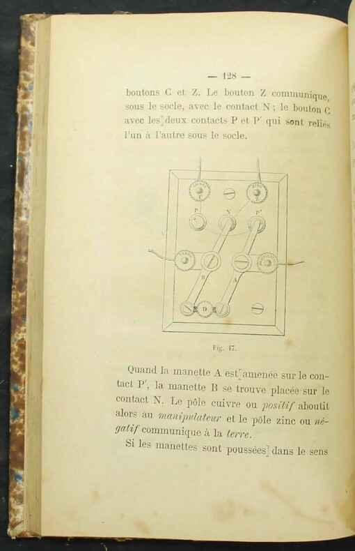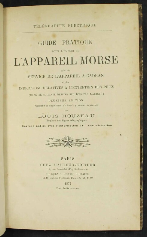 P., Chez l’auteur-éditeur, 1878. In 8 demi-chagrin, dos à nerfs orné, 225 pp. avec un tableau dépliant -16 pp. (supplément. Récepteur à dévidoir de côté) (Quatrième édition 1880). 4 pp. (signaux de l’appareil Morse) (1880).
