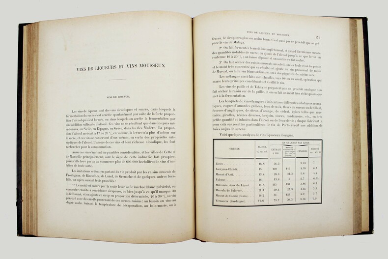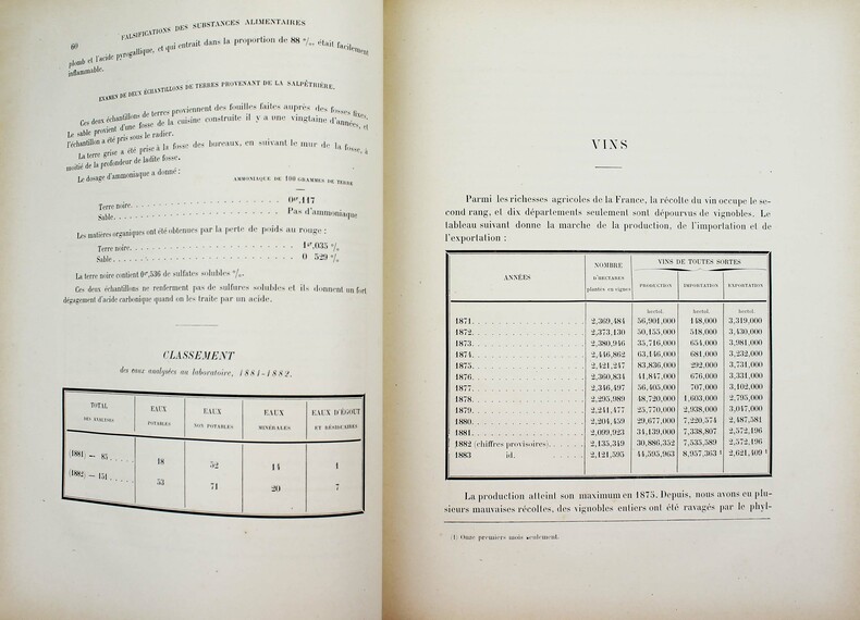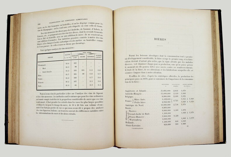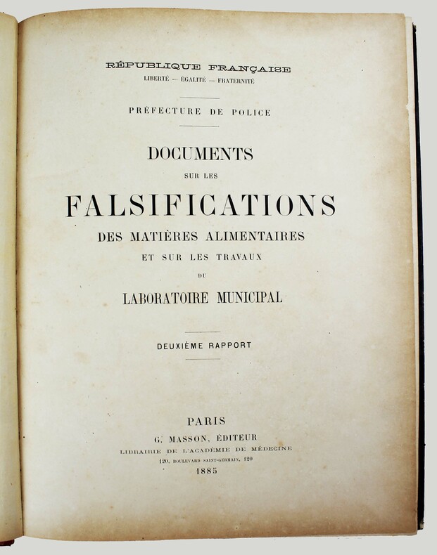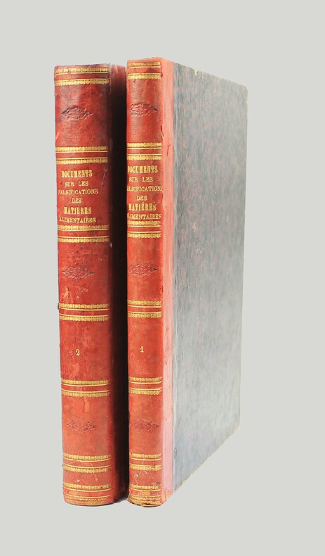 Etude des produits soumis au contrôle du laboratoire et des méthodes employées pour la recherche des falsifications. Le premier volume traite des boissons. Les vins : pp. 61 à 180. Bière pp. 181 à 232. Cidres, vinaigres, alcools, liqueurs : pp. 233 à 282. Deuxième rapport seul. Le premier traitait des développements successifs du laboratoire, de son installation matérielle, son personnel, son fonctionnement et ses travaux. Reliure un peu frottée. /// 2 volumes in-4 de (2), 282 / (2), 283 à 812, (4) pp. Demi-basane rouge, dos orné, tranches mouchetées. (Reliure de l'époque.) ////