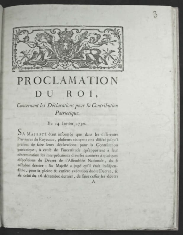 Illustré par un tableau dépliant hors-texte de l'état de situation par département de la Contribution Patriotique du royaume au 31 décembre 1790. Relié avec: - Contribution patriotique. Tableau de la correspondance avec les départements, jusqu'au 31 décembre inclusivement. (8) pp. - Contribution patriotique. Tableau de la correspondance, avec les départements, jusqu'au 28 février 1791. (12) pp., 3 tableaux dépliants hors-texte. - Instruction publiée par ordre du Roi, relativement à la Contribution Patriotique. Paris, Imprimerie royale, 1789. In-4 de 21, (3) pp. Mouillures sans gravité. /// In-4 de 6, (2) pp., 1 tableau dépliant hors-texte. Cartonnage moderne. ////
