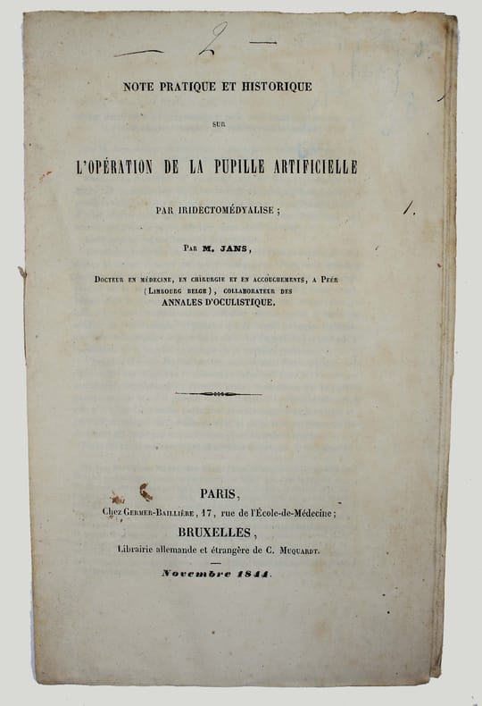 L'auteur était "docteur en médecine, en chirurgie et en accouchements, à Peer (Limbourg belge). "Tiré à part des "Annales d'oculistique", vol. XII, livraison 5, novembre 1843. /// In-8 de (2), 12, (2) pp. Broché, en feuilles tel que paru. ////