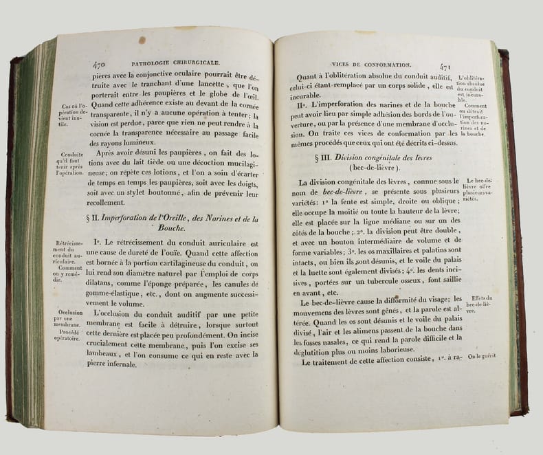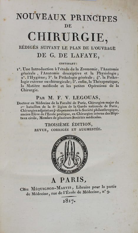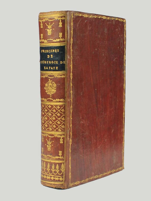 Quatrième édition revue, corrigée et augmentée, 1 vol. in-8 reliure de l'époque pleine basane marron, dos lisse orné, toutes tranches marbrées, Chez Méquignon-Marvis, Paris, 1822, XX-634 pp. Rappel du titre complet : Nouveaux Principes de Chirurgie, rédigés suivant le Plan de l'ouvrage de G. de Lafaye, contenant : 1e : Une introduction à l'étude de la Zoonomie, l'Anatomie générale, l'Anatomie descriptive et la Physiologie ; 2e : L'Hygiène ; 3e : La Pathologie générale ; 4e : La Pathologie externe ou chirurgicale ; 5e : enfin, la Thérapeutique, la Matière médicale et les petites Opérations de la Chirurgie.