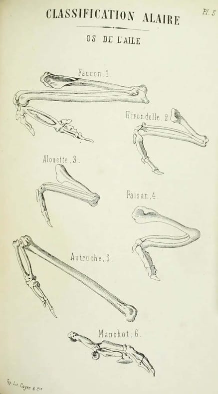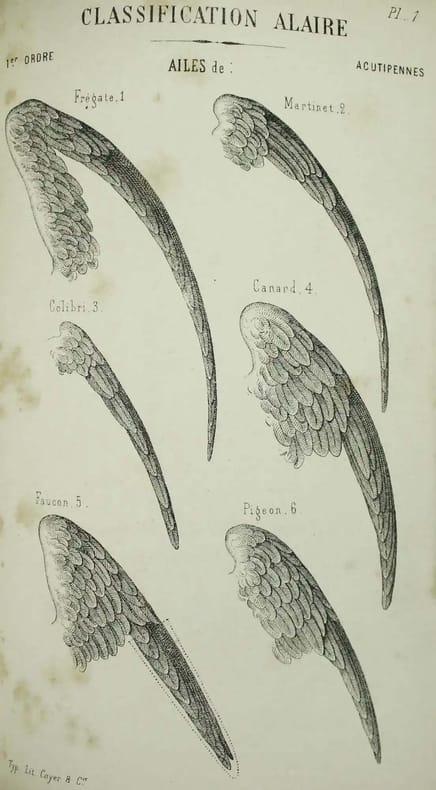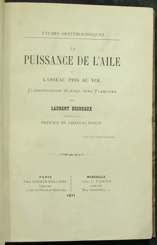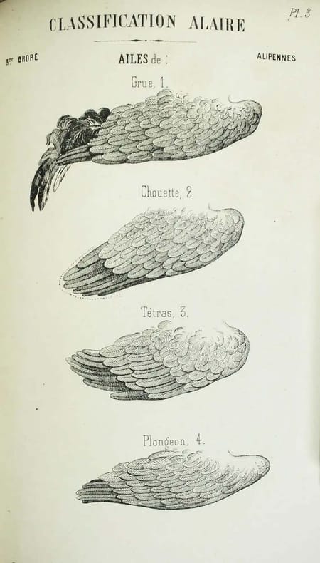 Seule édition de ce livre rare. L'aile peut devenir le pivot d'une classification, qui peut remplacer celles basées sur le bec et les pieds. Le vol. La classification présente. La classification alaire. Le martinet. La frégate. Le faucon, le colibri. Le canard. La bécasse... Illustré par 5 planches hors-texte d'ailes. Bon exemplaire. /// In-8 de 260 pp., 5 planches hors-texte. Demi-toile brique. (Relié vers 1900.) ////
