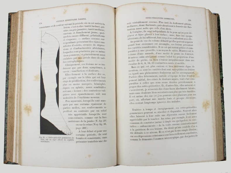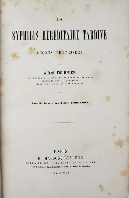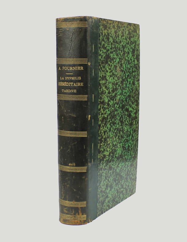 Edition originale. Jean Alfred Fournier (1832-1915), "one of the greatest syphiliologist, did more than any other person to develop the knowledge regarding congenital syphilis. Through his writings, the importance of syphilis as a cause of degenerative diseases was recognized". Garrison-Morton 2393. Illustré par 31 figures dans le texte d'Alfred Forgeron. Des rousseurs, petit manques de papier sur le second plat. /// In-8 de (4), 650 pp. Demi-basane verte, dos orné. (Reliure de l'époque.) ////