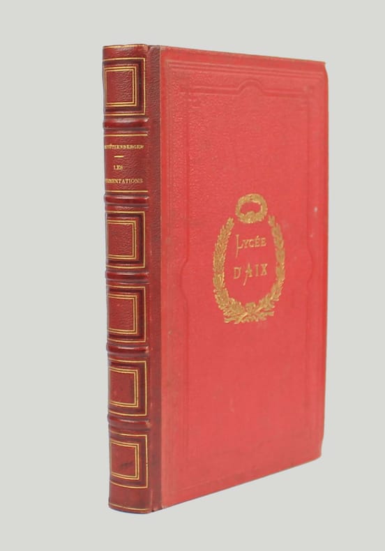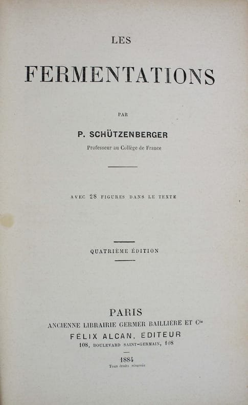 Fermentations dues aux organismes cellulaires ou fermentations directes. Matières albuminoïdes. Ferments solubles ou indirects. Origine des ferments. L'auteur, professeur au Collège de France, cite et commente abondamment les travaux de Pasteur. Quatrième édition, illustrée par 28 figures dans le texte. Premier plat doré aux armes du Lycée d'Aix. Bel exemplaire. /// In-8 de IV, (2), 278, (2) pp.; 32 pp. de catalogue. Demi-chagrin rouge, dos à nerfs orné, fer doré sur les plats. (Reliure de l'époque.) ////