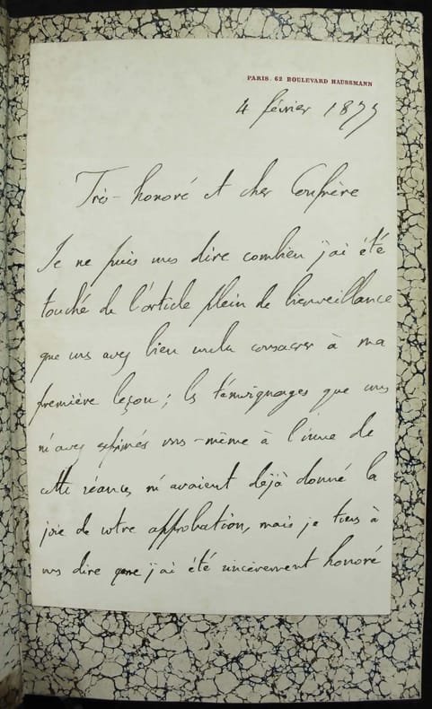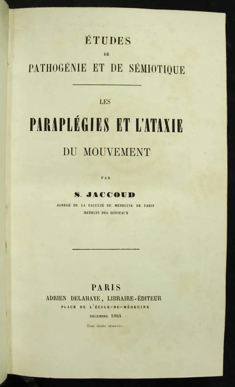 Première édition. Anatomie et physiologie de la moelle épinière. Pathogénie et sémiotique des paraplégies. Pathogénie et sémiotique du mouvement. Bon exemplaire. Joint : UNE LETTRE AUTOGRAPHE signée du 4 février 1877 adressée au Docteur Robert-Hippolyte Brochin (selon une note au crayon). Remerciement pour un article "plein de bienveillance" que celui-ci a consacré à la première leçon de l'auteur. /// In-8 de (4), 688, (2) pp. Demi-chagrin brun, dos à faux nerfs. (Reliure de l'époque.) ////