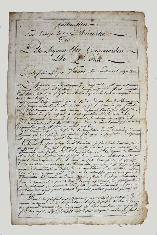 Prospectus manuscrit du XVIIIe siècle pour un pèse-liqueur. Texte encadré, titre bien calligraphié, quelques ratures. /// In-folio de 4 pp. ////