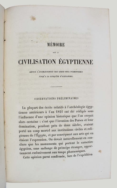 Première édition. Sur l'origine grecque des zodiaques prétendus égyptiens. L'isthme de Suez. Sur la séparation primitive des bassins de la mer Morte et de la mer Rouge. Mémoire sur la civilisation égyptienne. Mémoire sur le monument d'Osymandyas de Thèbes. Sur les écrits et les travaux géométriques et astronomique d'Eudoxe de Cnide, et sur quelques points relatifs à l'histoire de l'astronomie. Sur le revêtement des pyramides de Gizeh, sur les sculptures hiéroglyphiques qui les décoraient. Des rousseurs, sinon bel exemplaire. /// In-8 de portrait, (4), XXV, 424, (2) pp. Demi-chagrin vert, dos à nerfs orné. (Reliure de l'époque.) ////