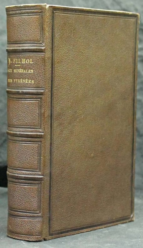 Paris, Masson [et] Toulouse, Feillès, Chauvin et Cie, 1853. In-12 (120 x 180 mm), XVI et 540 pages, reliure demi-veau d'époque, titre, auteur et filets dorés sur dos lisse, 7 tableaux dépliants, 3 planches dépliantes : Plan général des Thermes de Luchon - Détails d'un appareil conservateur du principe sulfureux pour la Buvette des Eaux de Labassère aux Bains de Théas à Bagnères de Bigorre - Appareil aspirateur de M. Boisgiraud qui a été employé pour analyser l'air des piscines, salles des douches, etc. .- Édouard FILHOL (1814-1883) était chimiste et devint professeur à l'école de médecine de sa ville. Il pratiqua aussi la minéralogie, l'hydrologie, l'étude des cavernes et fut un des premiers défenseurs de "l'Homme fossile". Maire de Toulouse, il créa le Muséum d'histoire naturelle (1865) dont Noulet souhaitait la création depuis 1831. (Dendaletche, 734 - Labarère, 572). Qqs lignes discrètement soulignées à l'encre sur une page. BON EXEMPLAIRE en reliure d'époque, complet des planches et tableaux dépliants. Petit ENVOI AUTOGRAPHE DE L'AUTEUR en page de garde (dédicace)